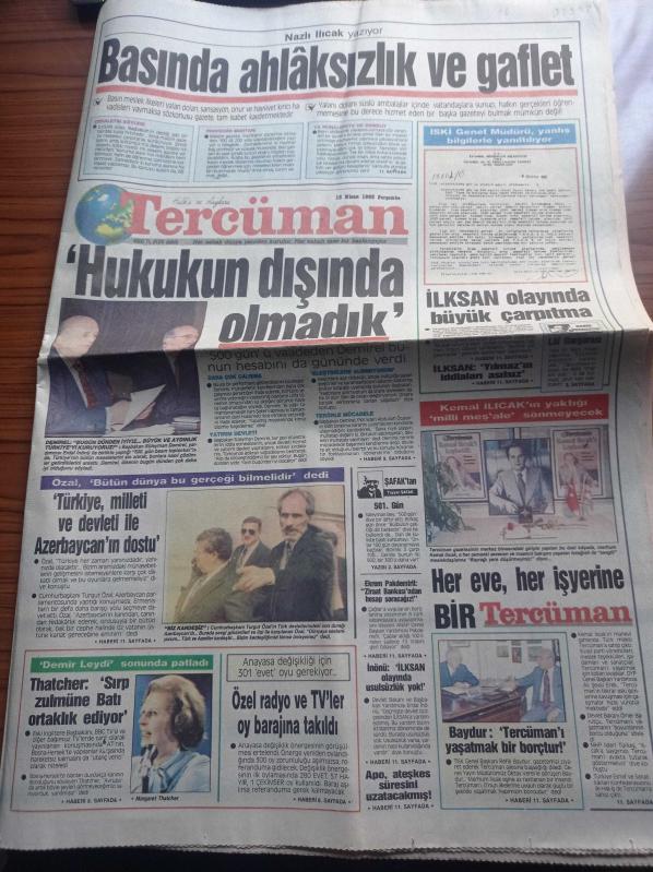 Halka Ve Olaylara Tercüman Gazetesi - 15 Nisan 1993 - Nazlı Ilıcak - Müzeyyen Senar - Basında Ahlaksızlık Ve Gaflet - Turgut Özal Türkiye Milleti Ve Devleti İle Azerbaycan'ın Dostu - Margaret Thatcher Sırp Zulmüne Batı Ortaklık Ediyor- İLKSAN Olayında Büyük Çarpıtma - Erdal İnönü İLKSAN Olayında Usulsüzlük Yok - TİSK Genel Başkanı Refik Baydur Tercüman'ı Yaşatmak Bir Borçtur - Kemal Ilıcak - Ekrem Pakdemirli adlı eser Türkçe dilindedir.