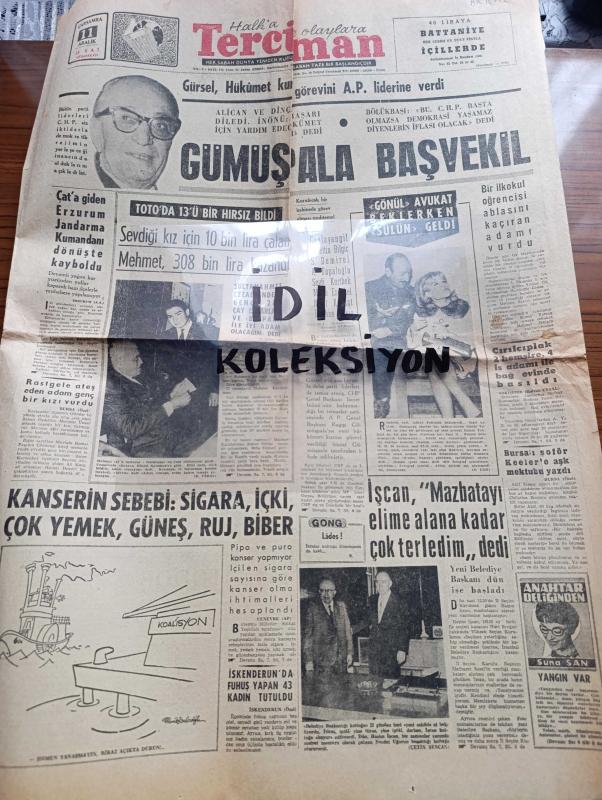 Halka ve Olaylara Tercüman Gazetesi - Turkish Newspaper - 11 Aralık 1963 - Cemal Gürsel hükümet kurma görevini Adalet Partisine verdi - Ragıp Gümüşpala Başvekil - Çat'a giden Erzurum jandarma kumandalı Albay Arif Türker kayboldu - Toto'da 13'ü Hırsız Mehmet Karaharman bildi Fotoğrafı - Gönül Yazar avukat beklerken Sülün Osman geldi fotoğraf - Belediye Başkanı Haşim İşcan mazbatayı elime alana kadar çok terledim dedi Fotoğrafı - Bursalı şoförler Christina Keeler'e aşk mektubu yazdı - kanserin sebebi sigara içki çok yemek güneş ruj ve biber - Yörük Ali Efe yazan Murat Sertoğlu Yazı Dizisi - ağır işitenlere müjde güden işitme enstitüsü açıldı - Sevim Çağlayan Sevim Tanürek Felek tablosunda Kazablanka gazinosunda - Avrupa kupa galipleri Kupası - Galatasaray Zürich'e karşı son kozunu kullanacak - Fenerbahçe Linfield'i eleyebilir - Selim Soydan Fotoğrafı - son namağlubu yenen takım İzmirspor - Galatasaray bütün selahiyetleri antrenör Coşkun Özarı'ya verdi - Tevfik Ünsi'nin görüşü, Kemal Ilıcak tarafından kaleme alınmıştır. Halka ve Olaylara Tercüman Gazetesi - Turkish Newspaper - 11 Aralık 1963 - Cemal Gürsel hükümet kurma görevini Adalet Partisine verdi - Ragıp Gümüşpala Başvekil - Çat'a giden Erzurum jandarma kumandalı Albay Arif Türker kayboldu - Toto'da 13'ü Hırsız Mehmet Karaharman bildi Fotoğrafı - Gönül Yazar avukat beklerken Sülün Osman geldi fotoğraf - Belediye Başkanı Haşim İşcan mazbatayı elime alana kadar çok terledim dedi Fotoğrafı - Bursalı şoförler Christina Keeler'e aşk mektubu yazdı - kanserin sebebi sigara içki çok yemek güneş ruj ve biber - Yörük Ali Efe yazan Murat Sertoğlu Yazı Dizisi - ağır işitenlere müjde güden işitme enstitüsü açıldı - Sevim Çağlayan Sevim Tanürek Felek tablosunda Kazablanka gazinosunda - Avrupa kupa galipleri Kupası - Galatasaray Zürich'e karşı son kozunu kullanacak - Fenerbahçe Linfield'i eleyebilir - Selim Soydan Fotoğrafı - son namağlubu yenen takım İzmirspor - Galatasaray bütün selahiyetleri antrenör Coşkun Özarı'ya verdi - Tevfik Ünsi'nin görüşü adlı eser Türkçe dilindedir.