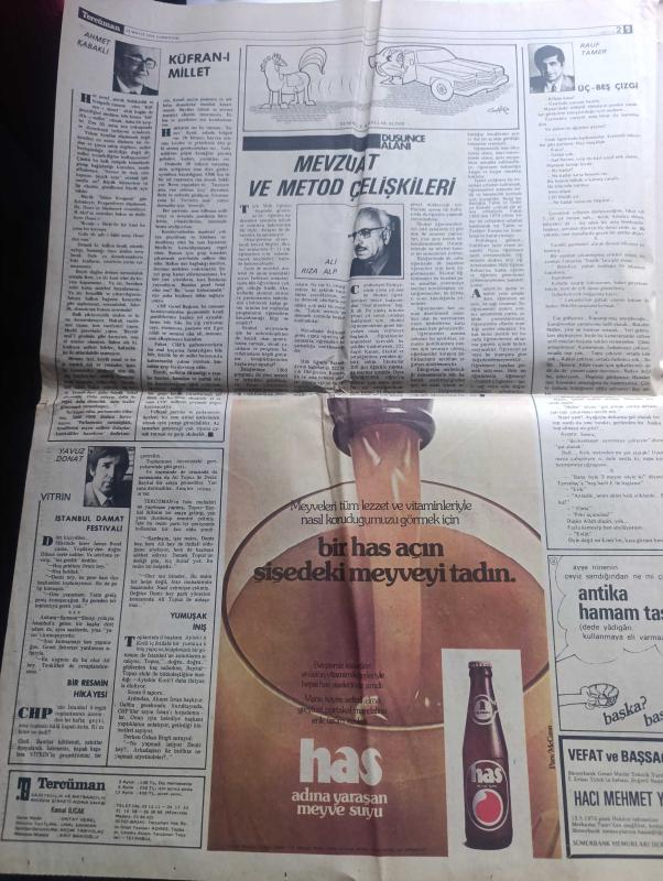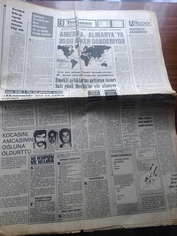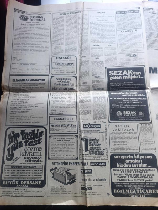 Halka ve Olaylara Tercüman Gazetesi - Turkish Newspaper - 15 Mayıs 1976 - konferans Kıbrıs tezimizi benimsiyor - 7. İslam ülkeleri Dışişleri bakanlığı konferansı - FKÖ Genel sekreteri Kaddumi dedi ki Türkiye'de büro açılması olumlu bir adımdır - Celal Bayar ve Süleyman Demirel baş başa yemek yedi fotoğraf - Bülent Ecevit Paris bir robotsun şefi İlhami Şükrü Polatay'la görülüyor - Bülent Ecevit ilk seçimde CHP iktidarda olacak - Danıştay'ın yetkileri anayasa ile sınırlıdır yazan Nazlı Ilıcak - Üç Beş çizgi yazan Rauf Tamer - Amerika Almanya'ya 3500 asker gönderiyor - Osmanlı tarihi yazan Lord Kinross Yazı Dizisi - tercüman gazetesinin armağanı tam sayfa Orhan Gazi portresi - televizyonda bugün - Edebi Roman Dönemeç'te yazan Tarık Buğra Yazı Dizisi - Sezak Halıları - Yasin Özdenak'ın jübilesini Galatasaray yapacaktır - Galatasaray kulüp başkanı Selahattin Beyazıt - imparator Beckenbauer Yazı Dizisi - Fenerbahçe kulübü başkanı Emin Cankurtaran Fenerbahçe'de her şeyi düzeltip çekileceğim adlı eser, Kitap > Süreli Yayınlar > Gazeteler > Türkiye > Genel > Günlük kategorisinde İkinci El olarak satıştadır.