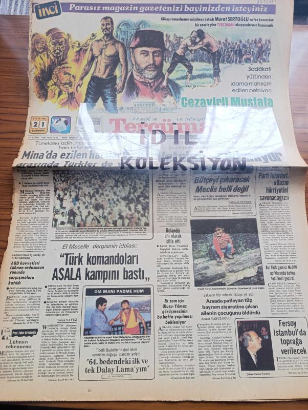 Halka ve Olaylara Tercüman Gazetesi - Turkish Newspaper - 21 Eylül 1983 - 1683 milletvekili adayı hakkında MGK incelemesinin sonuçları bugün açıklanıyor - tüneldeki izdihamda çok sayıda Hacı vefat etti - Mina'da ezilen Hacılar arasında Türkler de var - ABD Kuvvetleri Lübnan ordusunun yanında çarpışmalara katıldı - Kıbrıs Rum yönetimi Dışişleri Bakanı Rolandis ani olarak istifa etti - Başbakan Bülent Ulusu ile Türk İş Başkanı Şevket Yılmaz ek zam için görüşecek - Türk komandoları ASALA kampını bastı - Parti liderleri basın hürriyetini savunacağız dediler - Milli Eğitim eski bakanlarından Orhan Cemal Fersoy İstanbul'da toprağa verilecek - Sözün kısası yazan Rauf Tamer - Cumhurbaşkanı Kenan Evren kurban bayramının ilk günü kimsesiz çocuk ve yaşlılara ziyaret etti fotoğraf - Türkiye'nin ilk fermuarlı yatakları Fotoğrafı - 12 Eylül düşmanlarının utanmaz oyunları yazan Ergun Göze - MDP Genel Başkanı Turgut Subaşı ve kurucularına 130 bin mektup 29 bin telgraf geldi - TRT radyo programı adlı eser, Kitap > Süreli Yayınlar > Gazeteler > Türkiye > Genel > Günlük kategorisinde İkinci El olarak satıştadır.