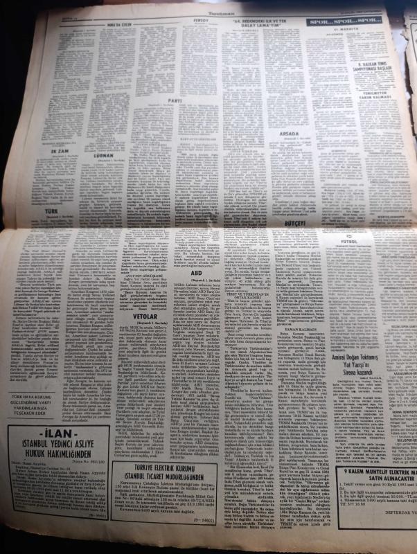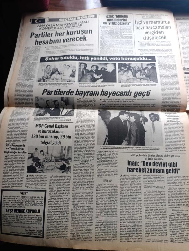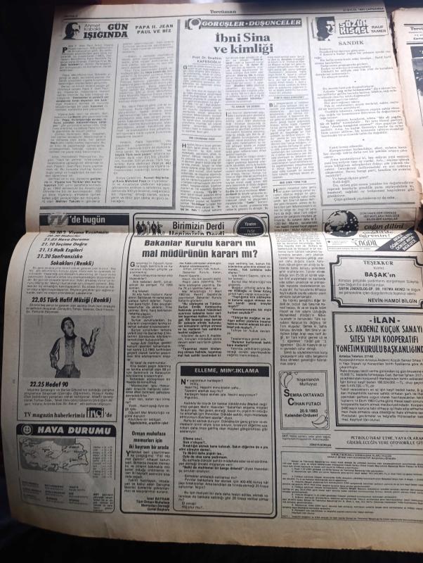 Halka ve Olaylara Tercüman Gazetesi - Turkish Newspaper - 21 Eylül 1983 - 1683 milletvekili adayı hakkında MGK incelemesinin sonuçları bugün açıklanıyor - tüneldeki izdihamda çok sayıda Hacı vefat etti - Mina'da ezilen Hacılar arasında Türkler de var - ABD Kuvvetleri Lübnan ordusunun yanında çarpışmalara katıldı - Kıbrıs Rum yönetimi Dışişleri Bakanı Rolandis ani olarak istifa etti - Başbakan Bülent Ulusu ile Türk İş Başkanı Şevket Yılmaz ek zam için görüşecek - Türk komandoları ASALA kampını bastı - Parti liderleri basın hürriyetini savunacağız dediler - Milli Eğitim eski bakanlarından Orhan Cemal Fersoy İstanbul'da toprağa verilecek - Sözün kısası yazan Rauf Tamer - Cumhurbaşkanı Kenan Evren kurban bayramının ilk günü kimsesiz çocuk ve yaşlılara ziyaret etti fotoğraf - Türkiye'nin ilk fermuarlı yatakları Fotoğrafı - 12 Eylül düşmanlarının utanmaz oyunları yazan Ergun Göze - MDP Genel Başkanı Turgut Subaşı ve kurucularına 130 bin mektup 29 bin telgraf geldi - TRT radyo programı, Kemal Ilıcak tarafından kaleme alınmıştır. Halka ve Olaylara Tercüman Gazetesi - Turkish Newspaper - 21 Eylül 1983 - 1683 milletvekili adayı hakkında MGK incelemesinin sonuçları bugün açıklanıyor - tüneldeki izdihamda çok sayıda Hacı vefat etti - Mina'da ezilen Hacılar arasında Türkler de var - ABD Kuvvetleri Lübnan ordusunun yanında çarpışmalara katıldı - Kıbrıs Rum yönetimi Dışişleri Bakanı Rolandis ani olarak istifa etti - Başbakan Bülent Ulusu ile Türk İş Başkanı Şevket Yılmaz ek zam için görüşecek - Türk komandoları ASALA kampını bastı - Parti liderleri basın hürriyetini savunacağız dediler - Milli Eğitim eski bakanlarından Orhan Cemal Fersoy İstanbul'da toprağa verilecek - Sözün kısası yazan Rauf Tamer - Cumhurbaşkanı Kenan Evren kurban bayramının ilk günü kimsesiz çocuk ve yaşlılara ziyaret etti fotoğraf - Türkiye'nin ilk fermuarlı yatakları Fotoğrafı - 12 Eylül düşmanlarının utanmaz oyunları yazan Ergun Göze - MDP Genel Başkanı Turgut Subaşı ve kurucularına 130 bin mektup 29 bin telgraf geldi - TRT radyo programı adlı eser Türkçe dilindedir.