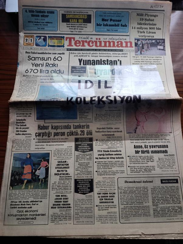 Halka ve Olaylara Tercüman Gazetesi - Turkish Newspaper - 21 Şubat 1982 - Samsun 60 Yeni rakı 670 lira oldu - Habur kapısında tankerin çarptığı peron çöktü 29 ölü - Kıbrıs konusunda Yunanistan'ı uyardık - Milli Eğitim Bakanı Hasan Sağlam rotasyon uygulaması Mayıs'ta başlayacak - İTO'nun 100. Kuruluş yıldönümü için düzenlenen moda fuarı Turgut Özal tarafından açıldı - 1918 yılında Ermenilerin yaptığı katliamı anlatan taş baskısı bir kitap bulundu - Hora'yı yeni seferler bekliyor - Yunus Emre ile sohbet yazan Ahmet Kabaklı - Elizabeth Taylor'la Richard Burton üçüncü defa evleniyorlar - Filistin davası Camp David'in dışında çözülebilir - Salvador Dali için müze açılıyor - Hicabi Koçyiğit davası duruşmasının tutanakları - aşk fısıltıları yazan Kerime Nadir Yazı Dizisi - Eşref Kolçak ve Ekrem Bora Banker Kastelli reklamı - Fenerbahçe'de Cevher Özden Ali Şen'e karşı başkan adayı Fotoğrafı - Oyak Renault Konya'da bir dev buldu - yılın filmi tövbe başrolde İbrahim Tatlıses - Lig Başlıyor adlı eser, Kitap > Süreli Yayınlar > Gazeteler > Türkiye > Genel > Günlük kategorisinde İkinci El olarak satıştadır.