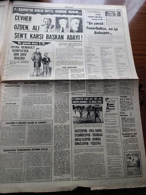 Halka ve Olaylara Tercüman Gazetesi - Turkish Newspaper - 21 Şubat 1982 - Samsun 60 Yeni rakı 670 lira oldu - Habur kapısında tankerin çarptığı peron çöktü 29 ölü - Kıbrıs konusunda Yunanistan'ı uyardık - Milli Eğitim Bakanı Hasan Sağlam rotasyon uygulaması Mayıs'ta başlayacak - İTO'nun 100. Kuruluş yıldönümü için düzenlenen moda fuarı Turgut Özal tarafından açıldı - 1918 yılında Ermenilerin yaptığı katliamı anlatan taş baskısı bir kitap bulundu - Hora'yı yeni seferler bekliyor - Yunus Emre ile sohbet yazan Ahmet Kabaklı - Elizabeth Taylor'la Richard Burton üçüncü defa evleniyorlar - Filistin davası Camp David'in dışında çözülebilir - Salvador Dali için müze açılıyor - Hicabi Koçyiğit davası duruşmasının tutanakları - aşk fısıltıları yazan Kerime Nadir Yazı Dizisi - Eşref Kolçak ve Ekrem Bora Banker Kastelli reklamı - Fenerbahçe'de Cevher Özden Ali Şen'e karşı başkan adayı Fotoğrafı - Oyak Renault Konya'da bir dev buldu - yılın filmi tövbe başrolde İbrahim Tatlıses - Lig Başlıyor, Kemal Ilıcak tarafından kaleme alınmıştır. Halka ve Olaylara Tercüman Gazetesi - Turkish Newspaper - 21 Şubat 1982 - Samsun 60 Yeni rakı 670 lira oldu - Habur kapısında tankerin çarptığı peron çöktü 29 ölü - Kıbrıs konusunda Yunanistan'ı uyardık - Milli Eğitim Bakanı Hasan Sağlam rotasyon uygulaması Mayıs'ta başlayacak - İTO'nun 100. Kuruluş yıldönümü için düzenlenen moda fuarı Turgut Özal tarafından açıldı - 1918 yılında Ermenilerin yaptığı katliamı anlatan taş baskısı bir kitap bulundu - Hora'yı yeni seferler bekliyor - Yunus Emre ile sohbet yazan Ahmet Kabaklı - Elizabeth Taylor'la Richard Burton üçüncü defa evleniyorlar - Filistin davası Camp David'in dışında çözülebilir - Salvador Dali için müze açılıyor - Hicabi Koçyiğit davası duruşmasının tutanakları - aşk fısıltıları yazan Kerime Nadir Yazı Dizisi - Eşref Kolçak ve Ekrem Bora Banker Kastelli reklamı - Fenerbahçe'de Cevher Özden Ali Şen'e karşı başkan adayı Fotoğrafı - Oyak Renault Konya'da bir dev buldu - yılın filmi tövbe başrolde İbrahim Tatlıses - Lig Başlıyor adlı eser Türkçe dilindedir.