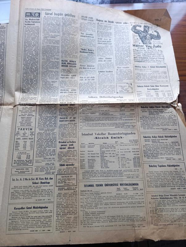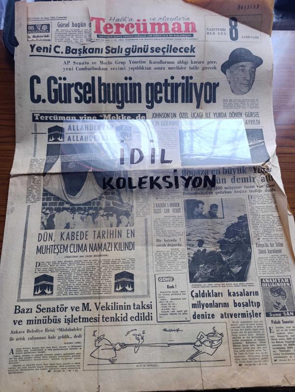 Halka ve Olaylara Tercüman Gazetesi - Turkish Newspaper - 26 Mart 1966 - Yeni Cumhurbaşkanı salı günü seçilecek - Cemal Gürsel bugün getiriliyor - Johnson'un özel uçağı ile yurda dönen Cemal Gürsel için Gülhane Hastanesi'nde özel bir oda ayrıldı - boğaza en büyük yüzer şehir SS. France dün demir attı Fotoğrafı - Konya'da bir İslam sitesi kuruluyor - Dün Kabe'de tarihin en muhteşem cuma namazı kılındı Fotoğrafı - bazı Senatör ve milletvekilinin taksi ve minibüs işletmesi tenkit edildi - 3 papatyalı kadın yazan Filiz Hataylı Yazı Dizisi - Abdülmecid Han'ın düşünce seviyesine hala erişemedik yazan S.A. Rıza Alp - iktisat dünyası - Mustafa Şenol yollara komünist olalım diye yazmış - İzmirli futbolcuların sığınağı Galatasaray - Metin Oktay Fotoğrafı - Beşiktaş için sigorta Galatasaray için ümit maçı yarın Mithatpaşa stadında - Galatasaray basketbol şubesi kaptanı Osman İncili şampiyonluğu Fenerbahçe'ye vermeyeceğiz dedi fotoğraf - Fenerbahçe kulüp başkanı Faruk Ilgaz ziyafet verdi, Kemal Ilıcak tarafından kaleme alınmıştır. Halka ve Olaylara Tercüman Gazetesi - Turkish Newspaper - 26 Mart 1966 - Yeni Cumhurbaşkanı salı günü seçilecek - Cemal Gürsel bugün getiriliyor - Johnson'un özel uçağı ile yurda dönen Cemal Gürsel için Gülhane Hastanesi'nde özel bir oda ayrıldı - boğaza en büyük yüzer şehir SS. France dün demir attı Fotoğrafı - Konya'da bir İslam sitesi kuruluyor - Dün Kabe'de tarihin en muhteşem cuma namazı kılındı Fotoğrafı - bazı Senatör ve milletvekilinin taksi ve minibüs işletmesi tenkit edildi - 3 papatyalı kadın yazan Filiz Hataylı Yazı Dizisi - Abdülmecid Han'ın düşünce seviyesine hala erişemedik yazan S.A. Rıza Alp - iktisat dünyası - Mustafa Şenol yollara komünist olalım diye yazmış - İzmirli futbolcuların sığınağı Galatasaray - Metin Oktay Fotoğrafı - Beşiktaş için sigorta Galatasaray için ümit maçı yarın Mithatpaşa stadında - Galatasaray basketbol şubesi kaptanı Osman İncili şampiyonluğu Fenerbahçe'ye vermeyeceğiz dedi fotoğraf - Fenerbahçe kulüp başkanı Faruk Ilgaz ziyafet verdi adlı eser Türkçe dilindedir.