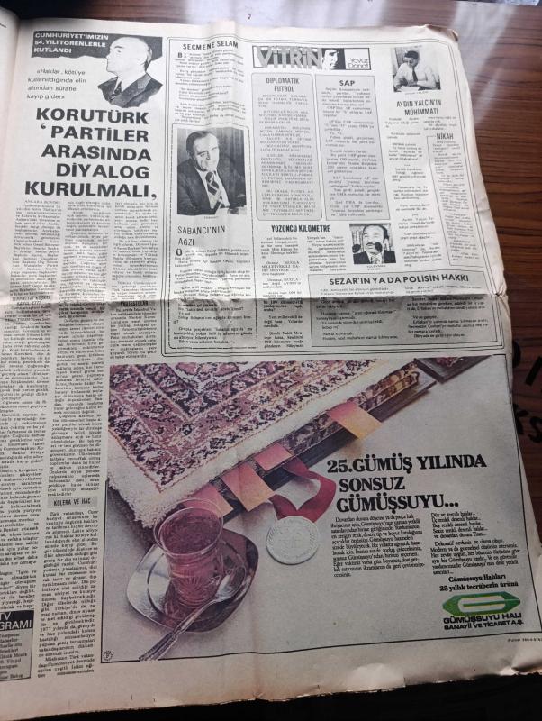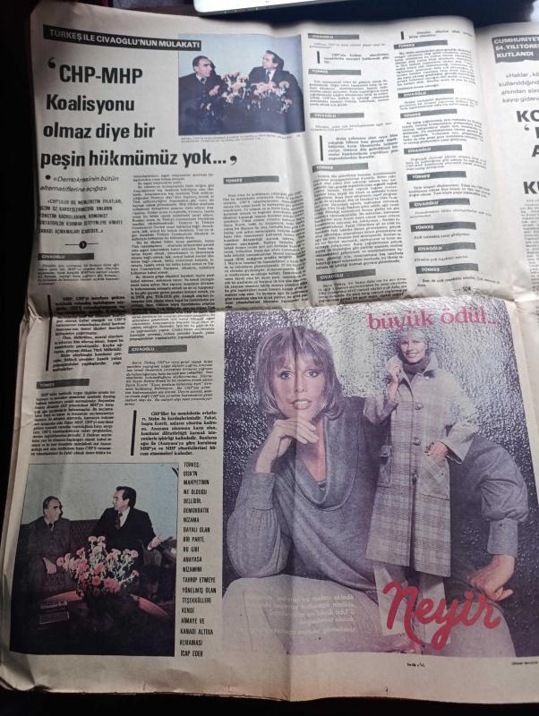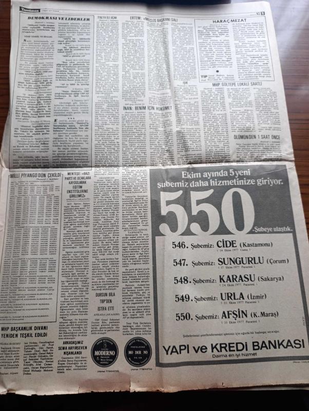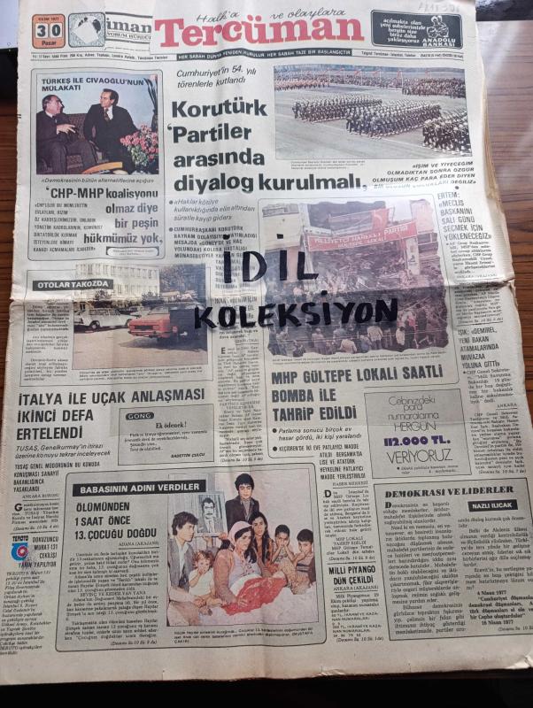 Halka ve Olaylara Tercüman Gazetesi - Turkish Newspaper - 30 Ekim 1977 - Alparslan Türkeş ile Güneri Civaoğlu'nun mülakatı fotoğraf - demokrasi ve liderler yazan Nazlı Ilıcak - cumhuriyetin 54. Yılı törenlerle kutlandı - Fahri Korutürk partiler arasında diyalog kurulmalı dedi - Adalet Partisi grup başkan vekili İlhami Ertem meclis başkanını salı günü seçmek için yükleneceğiz - MHP Gültepe lokali saatli bomba ile tahrip edildi - İtalya ile uçak anlaşması ikinci defa ertelendi - zavallı çağ yazan Rauf Tamer - Ziya Ül Hak 1 Kasım'da Türkiye'ye geliyor - Efeler geliyor Foto Roman - Sakıp Sabancı'nın ağzı - Vitrin Yavuz Donat - 100 bin ton bitkisel yağ açığı var - gençliğim eyvah yazan Tarık Buğra - Cihan pehlivanı Kara Ahmet yazan Eski Bir Pehlivan Yazı Dizisi - Milli piyango Dün çekildi - Milli Eğitim Bakanı Nahit Menteşe bazı Parti ve ocaklara kayıt olarak eğitim enstitülerine girilemez dedi - MHP başkanlık divanı yeniden teşkil edildi - arkadaşımız Sema Hayırseven nişanlandı, Kemal Ilıcak tarafından kaleme alınmıştır. Halka ve Olaylara Tercüman Gazetesi - Turkish Newspaper - 30 Ekim 1977 - Alparslan Türkeş ile Güneri Civaoğlu'nun mülakatı fotoğraf - demokrasi ve liderler yazan Nazlı Ilıcak - cumhuriyetin 54. Yılı törenlerle kutlandı - Fahri Korutürk partiler arasında diyalog kurulmalı dedi - Adalet Partisi grup başkan vekili İlhami Ertem meclis başkanını salı günü seçmek için yükleneceğiz - MHP Gültepe lokali saatli bomba ile tahrip edildi - İtalya ile uçak anlaşması ikinci defa ertelendi - zavallı çağ yazan Rauf Tamer - Ziya Ül Hak 1 Kasım'da Türkiye'ye geliyor - Efeler geliyor Foto Roman - Sakıp Sabancı'nın ağzı - Vitrin Yavuz Donat - 100 bin ton bitkisel yağ açığı var - gençliğim eyvah yazan Tarık Buğra - Cihan pehlivanı Kara Ahmet yazan Eski Bir Pehlivan Yazı Dizisi - Milli piyango Dün çekildi - Milli Eğitim Bakanı Nahit Menteşe bazı Parti ve ocaklara kayıt olarak eğitim enstitülerine girilemez dedi - MHP başkanlık divanı yeniden teşkil edildi - arkadaşımız Sema Hayırseven nişanlandı adlı eser Türkçe dilindedir.