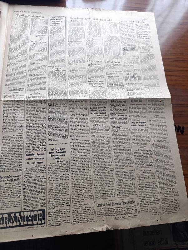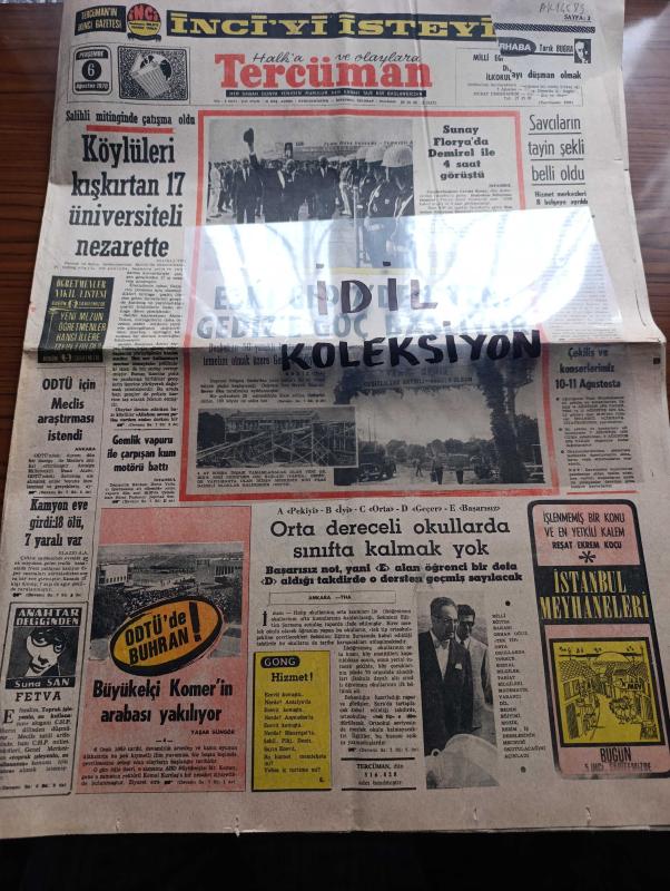 Halka ve Olaylara Tercüman Gazetesi - Turkish Newspaper - 6 Ağustos 1970 - Salihli mitinginde çatışma oldu - köylüleri kışkırtan 17 üniversitenin nezarette - Cumhurbaşkanı Cevdet Sunay Başbakan Süleyman Demirel ile 4 saat görüştü - Başbakan Süleyman Demirel 50 yataklı hastanenin temelini atmak üzere Gediz'e gidiyor - orta dereceli okullarda sınıfta kalmak yok - ODTÜ için meclis araştırması istendi - Milli Eğitim Bakanı Orhan Oğuz - Büyükelçi Komer'in arabası yakılıyor 6 Ocak 1969 - okuyucu mektupları üzerine yazan Halit Fahri Ozansoy - En kolayı düşman olmak yazan Tarık Buğra - Ankara İstanbul İzmir Radyosu programı - İstanbul meyhaneleri yazan Reşat Ekrem Koçu Yazı Dizisi - 3. Türkiye ligi ilk devre fikstürü - Hanımları aşıkhane sözlerle uyandıran bir saat yapıldı - Fenerbahçe'nin yeni antrenörü Constantin Teasca söylüyor futbolcular iki dakika sonra öğreniyor - fuar şehirleri kupası'nda Eskişehirspor Sevilla ile oynuyor - Galatasaray voleybol davasını kazandı - Erol Tarhan adlı eser, Kitap > Süreli Yayınlar > Gazeteler > Türkiye > Genel > Günlük kategorisinde İkinci El olarak satıştadır.