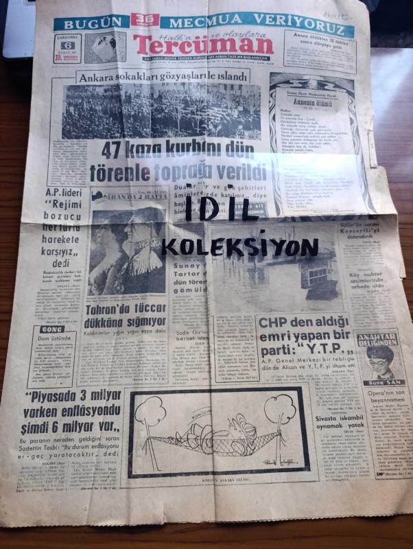 Halka ve Olaylara Tercüman Gazetesi - Turkish Newspaper - 6 Şubat 1963 - Ankara'da feci uçak kazasında ölenler askeri törenle toprağa verildi - Ankara sokakları gözyaşları ile ıslandı Fotoğrafı - albayraklara sarılmış 47 kişi Hacı Bayram camii'nde - annenin ölümü şiiri yazan Necip Fazıl Kısakürek - CHP'den aldığı emri yapan bir parti Yeni Türkiye Partisi - Edirne seller altında Fotoğrafı - Sivas'ta iskambil oynamak yasak - Sülün Osman'ın hocası Kayseri'liyi dolandırdı - Yirmi Sekiz Yıl Sonra İran'da 2 hafta yazan Murat Sertoğlu Yazı Dizisi - Saadet tacı yazan Kerime Nadir Yazı Dizisi - zekat sandıkları yazan Ahmet Kabaklı - Adalet Partisi genel başkanı Ragıp Gümüşpala'nın sözleri - uçak kazasında ölenlere fatihalı uğurlanış Fotoğrafı - Beşiktaş New York turnuvasına gidecek - Beşiktaşlı Güven Önüt'ün sakatlığı mühim değil - verdiği sözü tutan takım Karagümrük - En az gol yiyen kaleci Fenerbahçeli Hazım - milli Lig maçlarında bu haftaki hasılat 246.601 lira - Spor Toto, Kemal Ilıcak tarafından kaleme alınmıştır. Halka ve Olaylara Tercüman Gazetesi - Turkish Newspaper - 6 Şubat 1963 - Ankara'da feci uçak kazasında ölenler askeri törenle toprağa verildi - Ankara sokakları gözyaşları ile ıslandı Fotoğrafı - albayraklara sarılmış 47 kişi Hacı Bayram camii'nde - annenin ölümü şiiri yazan Necip Fazıl Kısakürek - CHP'den aldığı emri yapan bir parti Yeni Türkiye Partisi - Edirne seller altında Fotoğrafı - Sivas'ta iskambil oynamak yasak - Sülün Osman'ın hocası Kayseri'liyi dolandırdı - Yirmi Sekiz Yıl Sonra İran'da 2 hafta yazan Murat Sertoğlu Yazı Dizisi - Saadet tacı yazan Kerime Nadir Yazı Dizisi - zekat sandıkları yazan Ahmet Kabaklı - Adalet Partisi genel başkanı Ragıp Gümüşpala'nın sözleri - uçak kazasında ölenlere fatihalı uğurlanış Fotoğrafı - Beşiktaş New York turnuvasına gidecek - Beşiktaşlı Güven Önüt'ün sakatlığı mühim değil - verdiği sözü tutan takım Karagümrük - En az gol yiyen kaleci Fenerbahçeli Hazım - milli Lig maçlarında bu haftaki hasılat 246.601 lira - Spor Toto adlı eser Türkçe dilindedir.