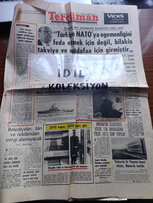 Halka ve Olaylara Tercüman Gazetesi - Turkish Newspaper - 8 Şubat 1970 - Süleyman Demirel ikili anlaşmalar konusunda bilgi verdi - Türkiye NATO'ya egemenliğini Feda etmek için değil bilakis takviye ve müdafaa için girmiştir - Adalet Partisi Senato grubu anlaşmazlığının halli için toplanıyor - Amerika'dan 150 bin ton buğday alacağız - Ankara'da elektriğe %139 hava gazına %147,5 zam yapıldı - belediyeler ilan ve reklamdan vergi alamayacak - Türkiye'de ilk organize sanayi bölgesi Manisa'da kuruldu - ODTÜ kapısı şato kapısı gibi Fotoğrafı - hac için kutsal beldeye her gün 20-25 Türk otobüsü geliyor fotoğraf - Üç yeni hücumbotu Deniz kuvvetlerine katılıyor - burç falı - kuvvet gösterileri yazan Tarık Buğra - Battal Gazi'nin torunu yazan Murat Sertoğlu Yazı Dizisi - Anadolu'nun fetih destanları yazan Mehmet Önder Yazı Dizisi - kabadayı Dündar Kılıç'ın kardeşinde de tabanca bulundu - Türkiye kupası'nda Galatasaray ve Eskişehir rahat bir rövanşa çıkıyorlar - Ahmet Taşçı herkesi boksör yaptı, Kemal Ilıcak tarafından kaleme alınmıştır. Halka ve Olaylara Tercüman Gazetesi - Turkish Newspaper - 8 Şubat 1970 - Süleyman Demirel ikili anlaşmalar konusunda bilgi verdi - Türkiye NATO'ya egemenliğini Feda etmek için değil bilakis takviye ve müdafaa için girmiştir - Adalet Partisi Senato grubu anlaşmazlığının halli için toplanıyor - Amerika'dan 150 bin ton buğday alacağız - Ankara'da elektriğe %139 hava gazına %147,5 zam yapıldı - belediyeler ilan ve reklamdan vergi alamayacak - Türkiye'de ilk organize sanayi bölgesi Manisa'da kuruldu - ODTÜ kapısı şato kapısı gibi Fotoğrafı - hac için kutsal beldeye her gün 20-25 Türk otobüsü geliyor fotoğraf - Üç yeni hücumbotu Deniz kuvvetlerine katılıyor - burç falı - kuvvet gösterileri yazan Tarık Buğra - Battal Gazi'nin torunu yazan Murat Sertoğlu Yazı Dizisi - Anadolu'nun fetih destanları yazan Mehmet Önder Yazı Dizisi - kabadayı Dündar Kılıç'ın kardeşinde de tabanca bulundu - Türkiye kupası'nda Galatasaray ve Eskişehir rahat bir rövanşa çıkıyorlar - Ahmet Taşçı herkesi boksör yaptı adlı eser Türkçe dilindedir.