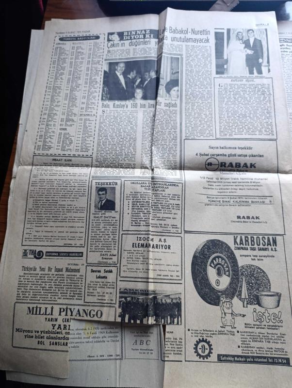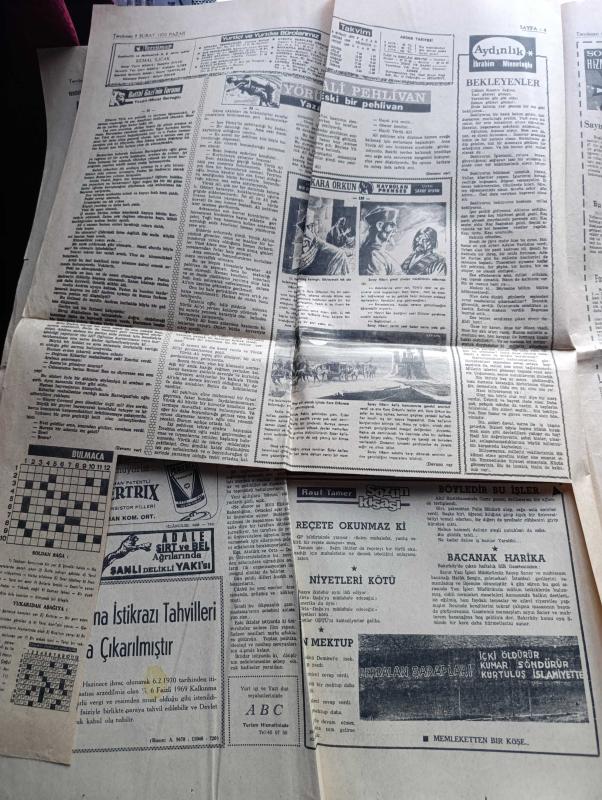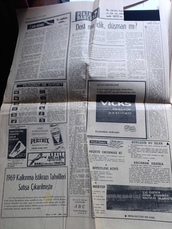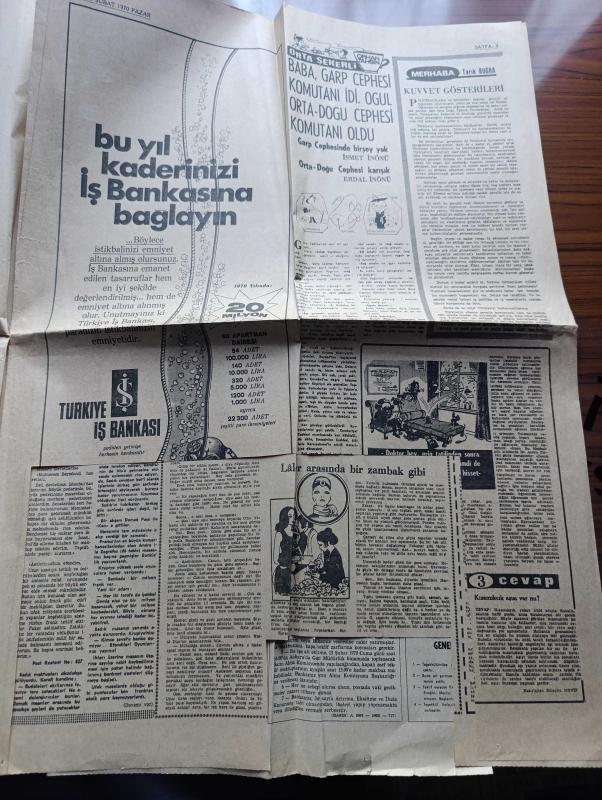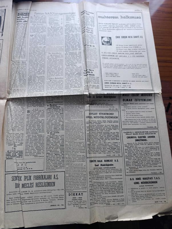 Halka ve Olaylara Tercüman Gazetesi - Turkish Newspaper - 8 Şubat 1970 - Süleyman Demirel ikili anlaşmalar konusunda bilgi verdi - Türkiye NATO'ya egemenliğini Feda etmek için değil bilakis takviye ve müdafaa için girmiştir - Adalet Partisi Senato grubu anlaşmazlığının halli için toplanıyor - Amerika'dan 150 bin ton buğday alacağız - Ankara'da elektriğe %139 hava gazına %147,5 zam yapıldı - belediyeler ilan ve reklamdan vergi alamayacak - Türkiye'de ilk organize sanayi bölgesi Manisa'da kuruldu - ODTÜ kapısı şato kapısı gibi Fotoğrafı - hac için kutsal beldeye her gün 20-25 Türk otobüsü geliyor fotoğraf - Üç yeni hücumbotu Deniz kuvvetlerine katılıyor - burç falı - kuvvet gösterileri yazan Tarık Buğra - Battal Gazi'nin torunu yazan Murat Sertoğlu Yazı Dizisi - Anadolu'nun fetih destanları yazan Mehmet Önder Yazı Dizisi - kabadayı Dündar Kılıç'ın kardeşinde de tabanca bulundu - Türkiye kupası'nda Galatasaray ve Eskişehir rahat bir rövanşa çıkıyorlar - Ahmet Taşçı herkesi boksör yaptı adlı eser, Kitap > Süreli Yayınlar > Gazeteler > Türkiye > Genel > Günlük kategorisinde İkinci El olarak satıştadır.
