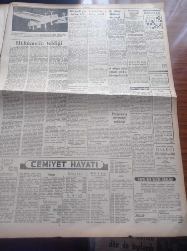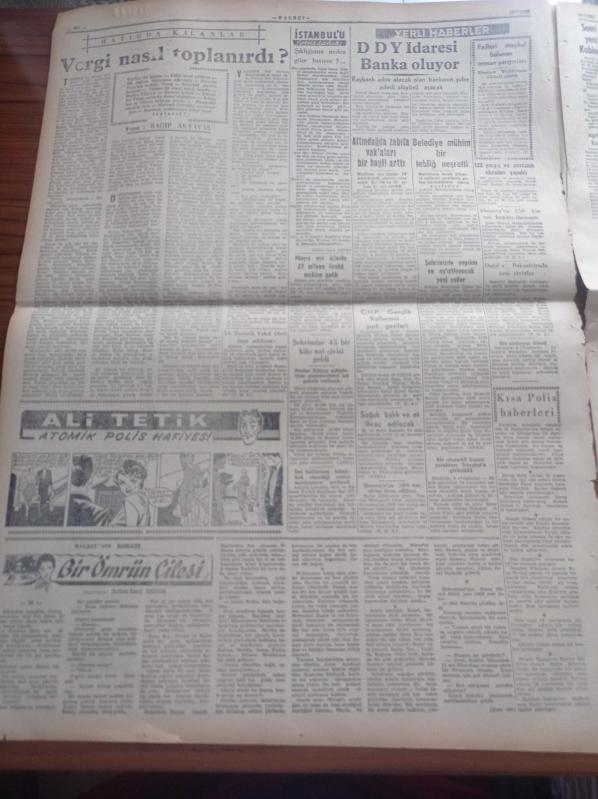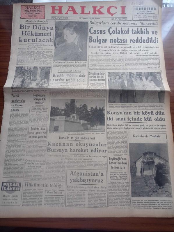 Halkçı Gazete - 10 Temmuz 1955 - Alimlerin İdaresinde Bir Dünya Hükümeti Kurulacak - Bulgarlara Cevabi Notamız Dün Verildi - Başbakan Adnan Menderes'in Sarıyar'daki Tetkikleri - Konya'nın Bir Köyü Dün İki Saat İçinde Kül Oldu - Kadınhanlı Mustafa - CHP Genel Başkanı İsmet İnönü Sigarayı Bıraktı - 30 Milyon Dolar Yardım Kredisi İşlemeye Başladı - Vali Ve Belediye Reisi Fahrettin Kerim Gökay'ın Yeni Harp İlanı - Ali Tetik Atomik Polis Hafiyesi - Halkçının Romanı Bir Ömrün Çilesi Nakleden Selami İzzet Sedes - Tiyatroların Yeni Edebi Heyeti Reşat Nuri Güntekin Fahri Celal Göktulga Refik Halit Karay Ve Cevat Fehmi Başkut - Suna Atıloğlu - Atatürk Devri Yazan Hüseyin Cahit Yalçın - Şehir Tiyatrosundan Portreler Haldun Sarıcı - Oyuncu Robert Wagner - Dikine Havalanan Uçak - Deniz Pentatlon Müsabakaları - İstanbul Kadınlar Futbol Takımı - Aziz Basmacı Ve Takımı, Nihat Erim tarafından kaleme alınmıştır. Halkçı Gazete - 10 Temmuz 1955 - Alimlerin İdaresinde Bir Dünya Hükümeti Kurulacak - Bulgarlara Cevabi Notamız Dün Verildi - Başbakan Adnan Menderes'in Sarıyar'daki Tetkikleri - Konya'nın Bir Köyü Dün İki Saat İçinde Kül Oldu - Kadınhanlı Mustafa - CHP Genel Başkanı İsmet İnönü Sigarayı Bıraktı - 30 Milyon Dolar Yardım Kredisi İşlemeye Başladı - Vali Ve Belediye Reisi Fahrettin Kerim Gökay'ın Yeni Harp İlanı - Ali Tetik Atomik Polis Hafiyesi - Halkçının Romanı Bir Ömrün Çilesi Nakleden Selami İzzet Sedes - Tiyatroların Yeni Edebi Heyeti Reşat Nuri Güntekin Fahri Celal Göktulga Refik Halit Karay Ve Cevat Fehmi Başkut - Suna Atıloğlu - Atatürk Devri Yazan Hüseyin Cahit Yalçın - Şehir Tiyatrosundan Portreler Haldun Sarıcı - Oyuncu Robert Wagner - Dikine Havalanan Uçak - Deniz Pentatlon Müsabakaları - İstanbul Kadınlar Futbol Takımı - Aziz Basmacı Ve Takımı adlı eser Türkçe dilindedir.
