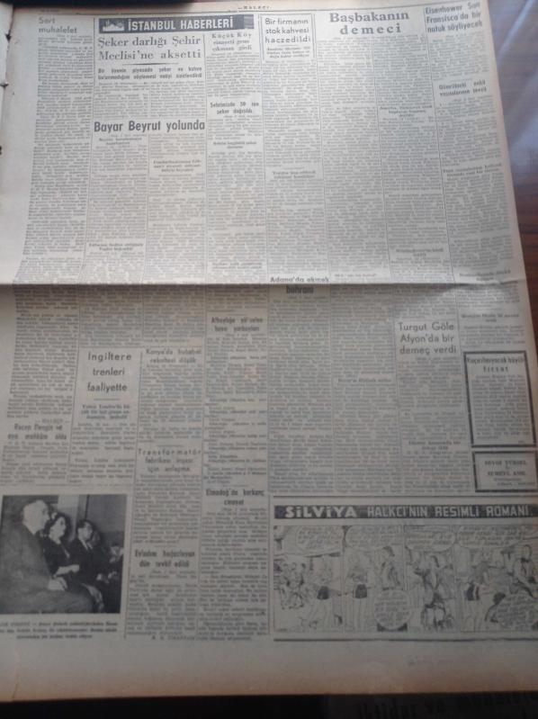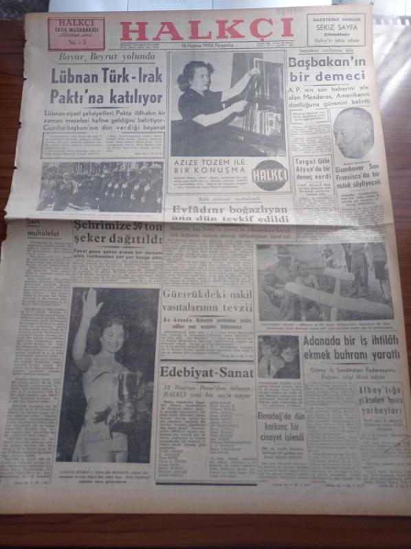 Halkçı Gazete - 16 Haziran 1955 - Celal Bayar Beyrut Yolunda - Lübnan Türk Irak Paktına Katılıyor - Amerikan Yardımına Dair Başbakan Adnan Menderes'in Bir Demeci - Avrupa Güzeli İlan Edilen İnga Britt Soedberg - Amerika Cumhurbaşkanı Eisenhower San Francisco'da Bir Nutuk Söyleyecek - Ali Tetik Atomik Polis Hafiyesi - Şehrimizde 59 Ton Şeker Dağıtıldı - Atatürk Devri Yazan Hüseyin Cahit Yalçın Yazı Dizisi - Film Yıldızı Belkıs Özener Yazar Gümüş Palas Aile Saz Salonunda- Atatürk Devri Yazan Hüseyin Cahit Yalçın Yazı Dizisi - Operet Sanatkârları Asuman Arsan - Sanatkar Portreleri Azize Tözem Ve Sanatı - İzmir'den Sesler Güler Göksel - Üstad Fahri Kopuz Geçmişi Dile Getiriyor - Sevdiğiniz Şarkılar Türküler Bu Gece Uymamışım- Eski Futbol Federasyonu Başkanı Orhan Şeref Apak'ın İtalya Maçı Hakkındaki Beyanatı - Milli Futbolcular Gene Fenerbahçe Stadında Çalıştı, Nihat Erim tarafından kaleme alınmıştır. Halkçı Gazete - 16 Haziran 1955 - Celal Bayar Beyrut Yolunda - Lübnan Türk Irak Paktına Katılıyor - Amerikan Yardımına Dair Başbakan Adnan Menderes'in Bir Demeci - Avrupa Güzeli İlan Edilen İnga Britt Soedberg - Amerika Cumhurbaşkanı Eisenhower San Francisco'da Bir Nutuk Söyleyecek - Ali Tetik Atomik Polis Hafiyesi - Şehrimizde 59 Ton Şeker Dağıtıldı - Atatürk Devri Yazan Hüseyin Cahit Yalçın Yazı Dizisi - Film Yıldızı Belkıs Özener Yazar Gümüş Palas Aile Saz Salonunda- Atatürk Devri Yazan Hüseyin Cahit Yalçın Yazı Dizisi - Operet Sanatkârları Asuman Arsan - Sanatkar Portreleri Azize Tözem Ve Sanatı - İzmir'den Sesler Güler Göksel - Üstad Fahri Kopuz Geçmişi Dile Getiriyor - Sevdiğiniz Şarkılar Türküler Bu Gece Uymamışım- Eski Futbol Federasyonu Başkanı Orhan Şeref Apak'ın İtalya Maçı Hakkındaki Beyanatı - Milli Futbolcular Gene Fenerbahçe Stadında Çalıştı adlı eser Türkçe dilindedir.