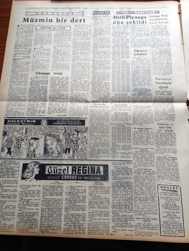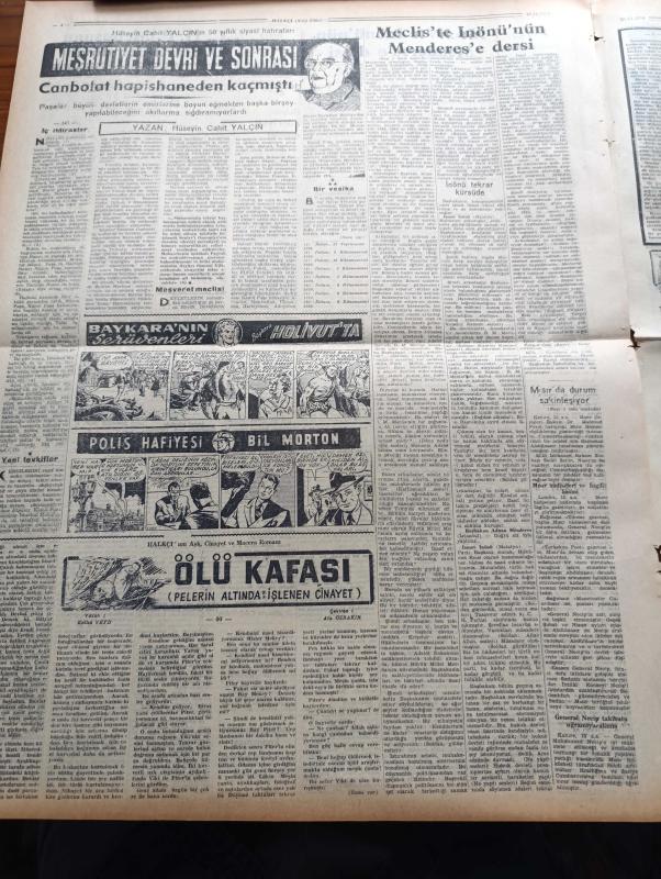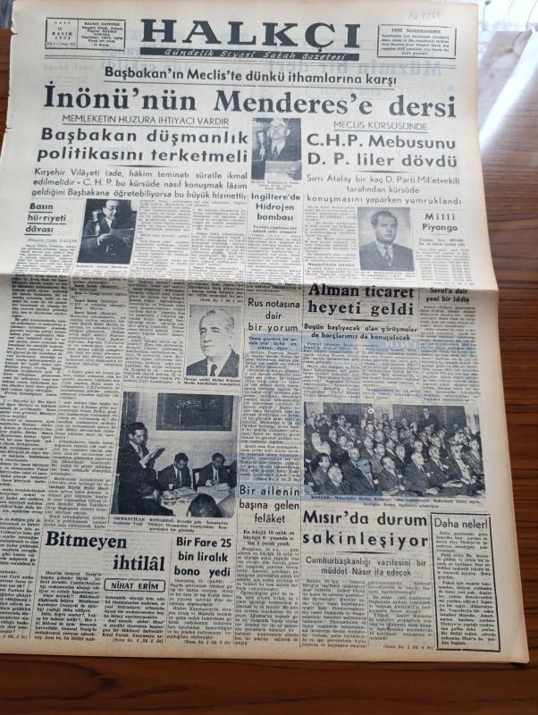 Halkçı Gazete - 16 Kasım 1954 - İsmet İnönü'nün Adnan Menderes'e Dersi - CHP Mebusu Sırrı Atalay'ı Demokrat Partililer Dövdü - Devlet Bakanı Mükerrem Sarol'a Dair Yeni Bir İddia - İngiltere'de Hidrojen Bombası - Milli Piyango Çekildi - Çetin Altan Köşe Yazısı - Güzel Regina Dedektif Cardoc'un Maceraları Yazan Georges Dejean Yazı Dizisi - Türkiye Eski Muharipler Birliği Kongresi - Hüseyin Cahit Yalçın'ın 50 Yıllık Siyasi Hatıraları Meşrutiyet Devri Ve Sonrası Yazı Dizisi - Ölü Kafası Pelerin Altında İşlenen Cinayet Yazan Ketlin Veyd Yazı Dizisi - Polis Hafiyesi Bil Morton Resimli Roman - Binbir Sırrı Olan Adam Eski Polis Müfettişi Thorp'un Hatıraları - Dost Mu Düşman Mı Yazan Oreste Pinto Yazı Dizisi - Ankara Kolejinin Atletleri Hazırlanıyor - İstanbul Greko Romen Takımı Seçildi - Dursun Ali Erbaş, Nihat Erim tarafından kaleme alınmıştır. Halkçı Gazete - 16 Kasım 1954 - İsmet İnönü'nün Adnan Menderes'e Dersi - CHP Mebusu Sırrı Atalay'ı Demokrat Partililer Dövdü - Devlet Bakanı Mükerrem Sarol'a Dair Yeni Bir İddia - İngiltere'de Hidrojen Bombası - Milli Piyango Çekildi - Çetin Altan Köşe Yazısı - Güzel Regina Dedektif Cardoc'un Maceraları Yazan Georges Dejean Yazı Dizisi - Türkiye Eski Muharipler Birliği Kongresi - Hüseyin Cahit Yalçın'ın 50 Yıllık Siyasi Hatıraları Meşrutiyet Devri Ve Sonrası Yazı Dizisi - Ölü Kafası Pelerin Altında İşlenen Cinayet Yazan Ketlin Veyd Yazı Dizisi - Polis Hafiyesi Bil Morton Resimli Roman - Binbir Sırrı Olan Adam Eski Polis Müfettişi Thorp'un Hatıraları - Dost Mu Düşman Mı Yazan Oreste Pinto Yazı Dizisi - Ankara Kolejinin Atletleri Hazırlanıyor - İstanbul Greko Romen Takımı Seçildi - Dursun Ali Erbaş adlı eser Türkçe dilindedir.