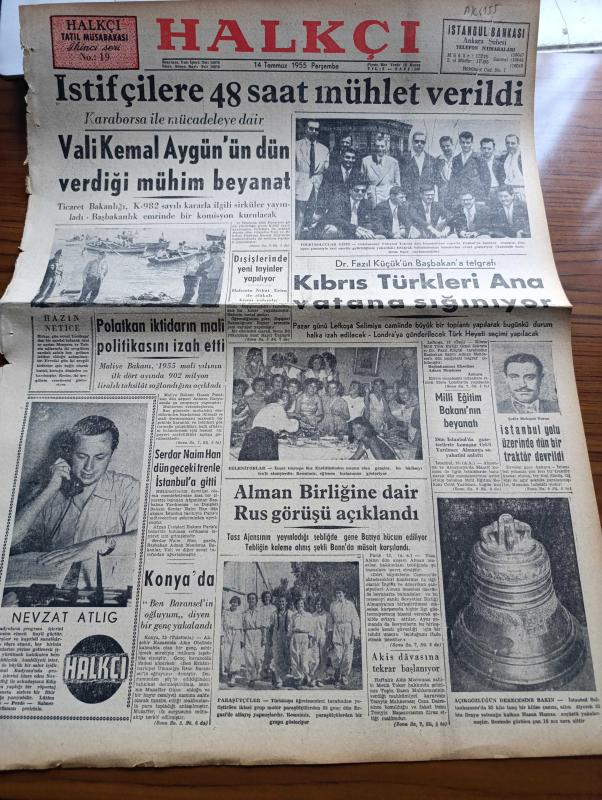 Halkçı Gazetesi - 14 Temmuz 1955 - İstifçilere 48 Saat Mühlet Verildi - Nevzat Atlıg - Karaborsa İzle Mücadele Dair Vali Kemal Aygün'ün Dün Verdiği Mühim Beyanat - Hasan Polatkan İktidarın Mali Politikasını İzah Etti - Doktor Fazıl Küçük'ün Başbakan Adnan Menderes'e Telgrafı - Alman Birliğine Dair Rus Görüşü Açıklandı - Milli Eğitim Bakanı Celal Yardımcı'nın Beyanatı - Halkçı'nın Romanı Bir Ömrün Çilesi Nakleden Selami İzzet Sedes Yazı Dizisi - Köy Enstitüsü Mezunu Öğretmenlerin Yeni Terfi Kanunu - Halk Bankasının Sermayesi 20 Milyon Liraya Çıkarılıyor - Film Muzaffer Tema Bir Ay Hapse Mahkum Oldu - Silviya Halkçı'nın Resimli Romanı - Mahkumlar Cehennemi Yazan Osman Şan Yazı Dizisi - Siyah Süvari Yazan Valentine Williams Yazı Dizisi - Hüseyin Cahit Yalçın'ın 50 Yıllık Hatıraları Atatürk Devri Yazan Hüseyin Cahit Yalçın Yazı Dizisi - Bravo Muhammer Karaca'ya - Halkçı'nın Hikayesi Renk Değişimi - Genç Takımlar Grup Maçları - Yugoslavya'ya Gidecek Boks Takımının Seçmesi - Yaşar Doğu, Nihat Erim tarafından kaleme alınmıştır. Halkçı Gazetesi - 14 Temmuz 1955 - İstifçilere 48 Saat Mühlet Verildi - Nevzat Atlıg - Karaborsa İzle Mücadele Dair Vali Kemal Aygün'ün Dün Verdiği Mühim Beyanat - Hasan Polatkan İktidarın Mali Politikasını İzah Etti - Doktor Fazıl Küçük'ün Başbakan Adnan Menderes'e Telgrafı - Alman Birliğine Dair Rus Görüşü Açıklandı - Milli Eğitim Bakanı Celal Yardımcı'nın Beyanatı - Halkçı'nın Romanı Bir Ömrün Çilesi Nakleden Selami İzzet Sedes Yazı Dizisi - Köy Enstitüsü Mezunu Öğretmenlerin Yeni Terfi Kanunu - Halk Bankasının Sermayesi 20 Milyon Liraya Çıkarılıyor - Film Muzaffer Tema Bir Ay Hapse Mahkum Oldu - Silviya Halkçı'nın Resimli Romanı - Mahkumlar Cehennemi Yazan Osman Şan Yazı Dizisi - Siyah Süvari Yazan Valentine Williams Yazı Dizisi - Hüseyin Cahit Yalçın'ın 50 Yıllık Hatıraları Atatürk Devri Yazan Hüseyin Cahit Yalçın Yazı Dizisi - Bravo Muhammer Karaca'ya - Halkçı'nın Hikayesi Renk Değişimi - Genç Takımlar Grup Maçları - Yugoslavya'ya Gidecek Boks Takımının Seçmesi - Yaşar Doğu adlı eser Türkçe dilindedir.