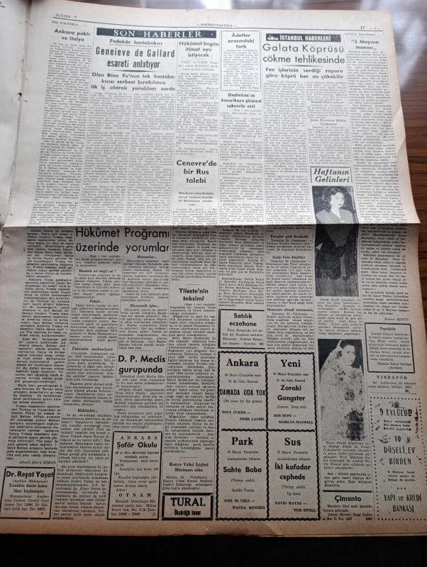 Halkçı Gazetesi - Turkish Newspaper - 26 Mayıs 1954 - Demokrat Parti içinde asalet yazan Hüseyin Cahit Yalçın Başmakale - güreşçilerimizin Tokyo'da büyük zaferi - güreşte Dünya şampiyonuyuz - takımımız bir puan farkla Rusları yendi - Hüseyin Akbaş'la Mustafa Dağıstanlı dünya şampiyonu oldular 4 ikinciliğimiz var - hükümet programı üzerinde yorumlar - Başbakan Adnan Menderes'in Amerika'ya gitmesi takarrür etti - devlet konservatuar imtihanında Gülden Aruman kemanı ile imtihan kapısında fotoğraf - maddi ve manevi asayiş yazan Nihat Erim - Kan kokan kadın nakleden SİS Yazı Dizisi - Ankara Paktı ve İtalya yazan Ahmet Şükrü Esmer - 2 mayısın manası yazan Bülent Ecevit - damada oda yok filmi Ankara sinemasında - sahte Baba filmi Park sinemasında - Galata köprüsü çökme tehlikesinde - dünyanın en ilgi çeken zengini Aga Han hayatını anlatıyor yazı dizisi - Ankara'da taksiler eczaneler listesi - çocuk sayfası - bilmece bulmaca - Nasrettin hoca'nın kuzusu - küçük kardeşlerin köşesi - Şiir adlı eser, Kitap > Süreli Yayınlar > Gazeteler > Türkiye > Genel > Günlük kategorisinde İkinci El olarak satıştadır.
