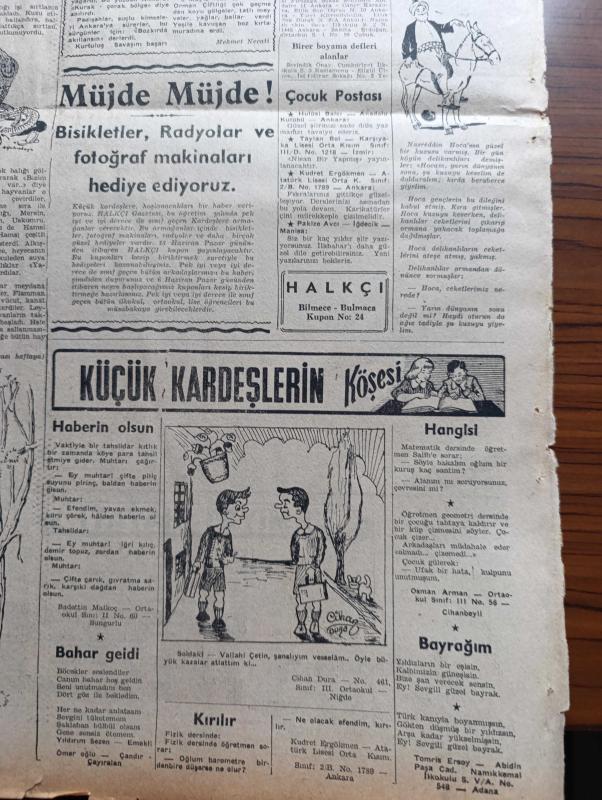 Halkçı Gazetesi - Turkish Newspaper - 26 Mayıs 1954 - Demokrat Parti içinde asalet yazan Hüseyin Cahit Yalçın Başmakale - güreşçilerimizin Tokyo'da büyük zaferi - güreşte Dünya şampiyonuyuz - takımımız bir puan farkla Rusları yendi - Hüseyin Akbaş'la Mustafa Dağıstanlı dünya şampiyonu oldular 4 ikinciliğimiz var - hükümet programı üzerinde yorumlar - Başbakan Adnan Menderes'in Amerika'ya gitmesi takarrür etti - devlet konservatuar imtihanında Gülden Aruman kemanı ile imtihan kapısında fotoğraf - maddi ve manevi asayiş yazan Nihat Erim - Kan kokan kadın nakleden SİS Yazı Dizisi - Ankara Paktı ve İtalya yazan Ahmet Şükrü Esmer - 2 mayısın manası yazan Bülent Ecevit - damada oda yok filmi Ankara sinemasında - sahte Baba filmi Park sinemasında - Galata köprüsü çökme tehlikesinde - dünyanın en ilgi çeken zengini Aga Han hayatını anlatıyor yazı dizisi - Ankara'da taksiler eczaneler listesi - çocuk sayfası - bilmece bulmaca - Nasrettin hoca'nın kuzusu - küçük kardeşlerin köşesi - Şiir, Nihat Erim tarafından kaleme alınmıştır. Halkçı Gazetesi - Turkish Newspaper - 26 Mayıs 1954 - Demokrat Parti içinde asalet yazan Hüseyin Cahit Yalçın Başmakale - güreşçilerimizin Tokyo'da büyük zaferi - güreşte Dünya şampiyonuyuz - takımımız bir puan farkla Rusları yendi - Hüseyin Akbaş'la Mustafa Dağıstanlı dünya şampiyonu oldular 4 ikinciliğimiz var - hükümet programı üzerinde yorumlar - Başbakan Adnan Menderes'in Amerika'ya gitmesi takarrür etti - devlet konservatuar imtihanında Gülden Aruman kemanı ile imtihan kapısında fotoğraf - maddi ve manevi asayiş yazan Nihat Erim - Kan kokan kadın nakleden SİS Yazı Dizisi - Ankara Paktı ve İtalya yazan Ahmet Şükrü Esmer - 2 mayısın manası yazan Bülent Ecevit - damada oda yok filmi Ankara sinemasında - sahte Baba filmi Park sinemasında - Galata köprüsü çökme tehlikesinde - dünyanın en ilgi çeken zengini Aga Han hayatını anlatıyor yazı dizisi - Ankara'da taksiler eczaneler listesi - çocuk sayfası - bilmece bulmaca - Nasrettin hoca'nın kuzusu - küçük kardeşlerin köşesi - Şiir adlı eser Türkçe dilindedir.