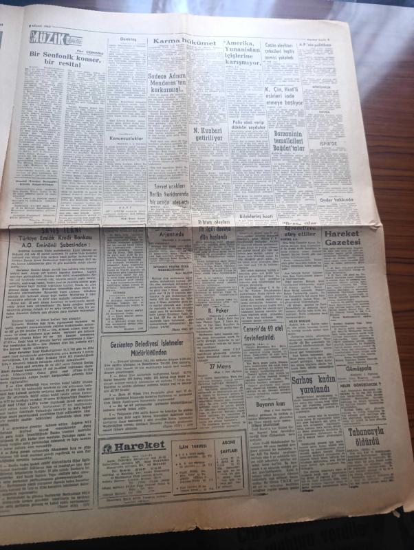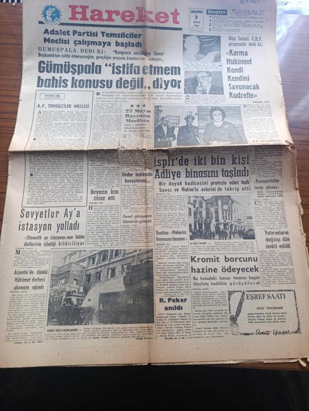 Hareket Gazetesi - Turkish Newspaper - 3 Nisan 1963 - Adalet Partisi temsilciler Meclisi çalışmaya başladı - Ragıp Gümüşpala istifa etmem bahis konusu değildir diyor - İsmet İnönü CHP grubunda dedi ki karma hükümet kendi kendini savunacak kudrette - 27 Mayıs bayramı mecliste - ispir'de iki bin kişi adliye binasını taşladı - Rauf Denktaş makarios anayasayı bozuyor dedi - Sovyetler Ay'a istasyon yolladı - eski başbakanlardan Recep Peker anıldı - sakız çiğniyoruz yazan Adnan Veli - İstanbul Ankara Radyosu Programı - Mussolini'yi nasıl kaçırdım anlatan Otto Skorzeny yazı dizisi - boydan boya kırık ayna Yazan Agatha Christie Yazı Dizisi - Tekbir'in dünyası yazan Reşat Ekrem Koçu Yazı Dizisi - müzik yazan Fikri Çiçekoğlu - Barzani'nin temsilcileri Bağdattalar - Galatasaray antrenörü Gündüz Kılıç kendimizi seyirciye alkışlatacağız dedi fotoğraf - İngiltere kral kupası adayı Leicester City - tenis milli takımı bugün kampa giriyor - Ordu takımının kampı 25 Nisan'da tekrar başlıyor, Mehmet Ali Yalçın tarafından kaleme alınmıştır. Hareket Gazetesi - Turkish Newspaper - 3 Nisan 1963 - Adalet Partisi temsilciler Meclisi çalışmaya başladı - Ragıp Gümüşpala istifa etmem bahis konusu değildir diyor - İsmet İnönü CHP grubunda dedi ki karma hükümet kendi kendini savunacak kudrette - 27 Mayıs bayramı mecliste - ispir'de iki bin kişi adliye binasını taşladı - Rauf Denktaş makarios anayasayı bozuyor dedi - Sovyetler Ay'a istasyon yolladı - eski başbakanlardan Recep Peker anıldı - sakız çiğniyoruz yazan Adnan Veli - İstanbul Ankara Radyosu Programı - Mussolini'yi nasıl kaçırdım anlatan Otto Skorzeny yazı dizisi - boydan boya kırık ayna Yazan Agatha Christie Yazı Dizisi - Tekbir'in dünyası yazan Reşat Ekrem Koçu Yazı Dizisi - müzik yazan Fikri Çiçekoğlu - Barzani'nin temsilcileri Bağdattalar - Galatasaray antrenörü Gündüz Kılıç kendimizi seyirciye alkışlatacağız dedi fotoğraf - İngiltere kral kupası adayı Leicester City - tenis milli takımı bugün kampa giriyor - Ordu takımının kampı 25 Nisan'da tekrar başlıyor adlı eser Türkçe dilindedir.