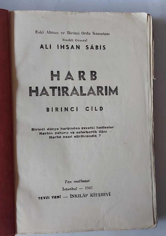Harp Hatıralarım Cilt: 1 [İLK BASKI], Ali İhsan Sabis (Eski 6.ve 1.Ordu Kom.) tarafından kaleme alınmıştır. Kitap 1943 yılında İnkılap Kitabevi (Tevzi Yeri) tarafından [İstanbul] yayınlanmıştır. 196 sayfadır. Harp Hatıralarım Cilt: 1 [İLK BASKI] adlı eser Türkçe dilindedir.