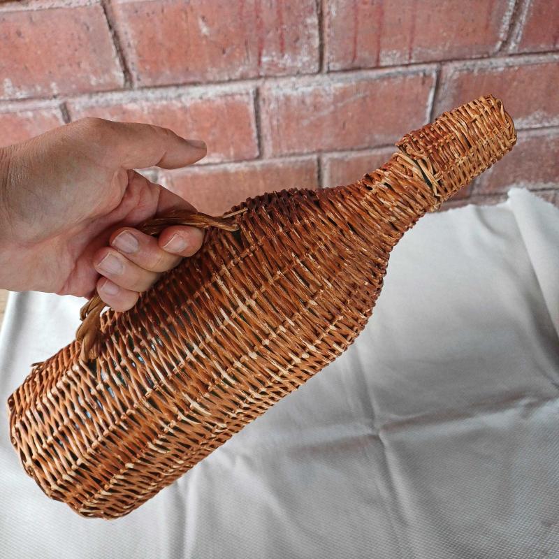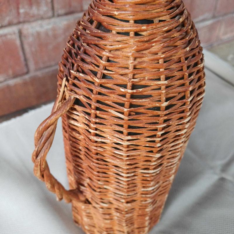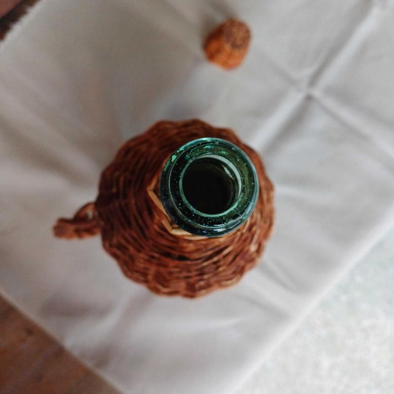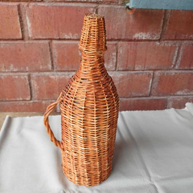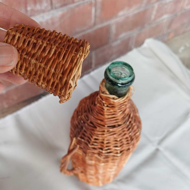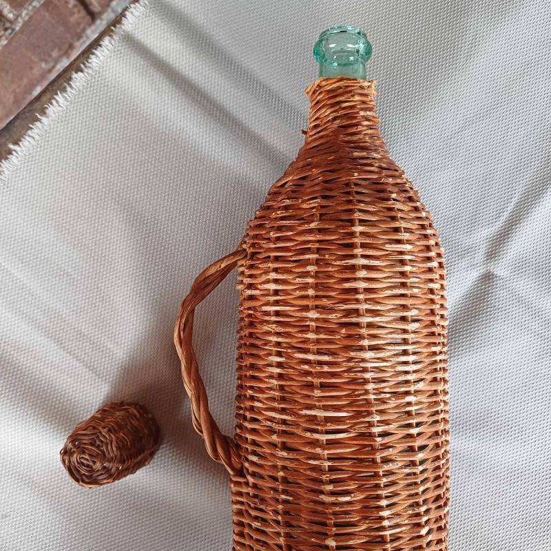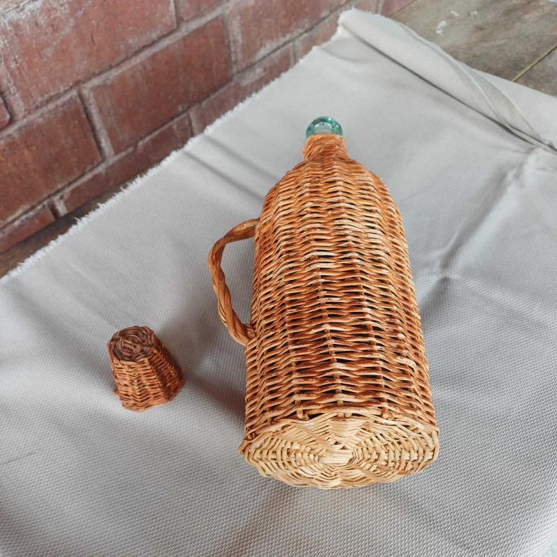 Hasir orgulu,kapakli cam sise. Sise yesil renkte. Kendi kspagi yok.Bir mantar takilabilir. Sadece hasir kapak mevcut. Taban,sise ve kapak hasirdan ve kulbu var. Vintage.