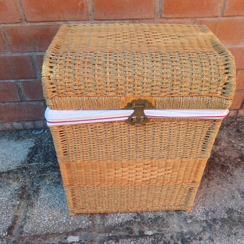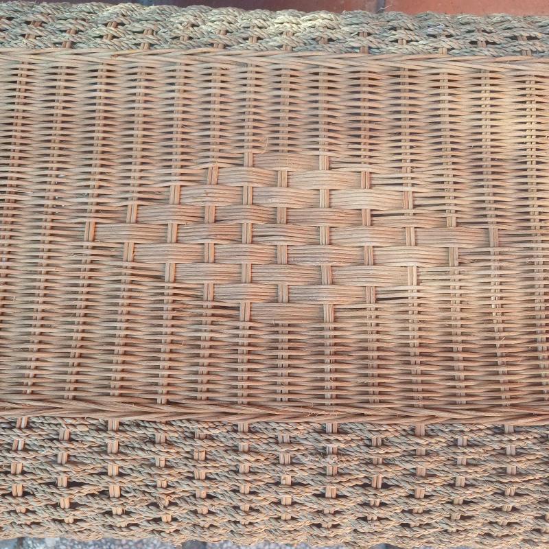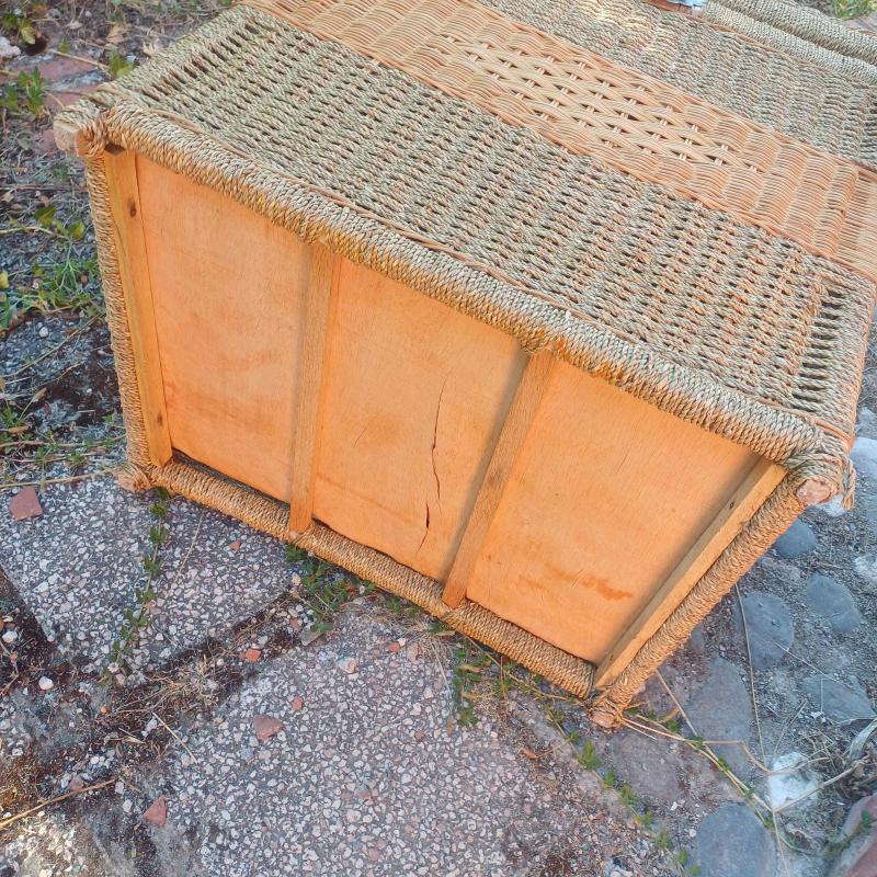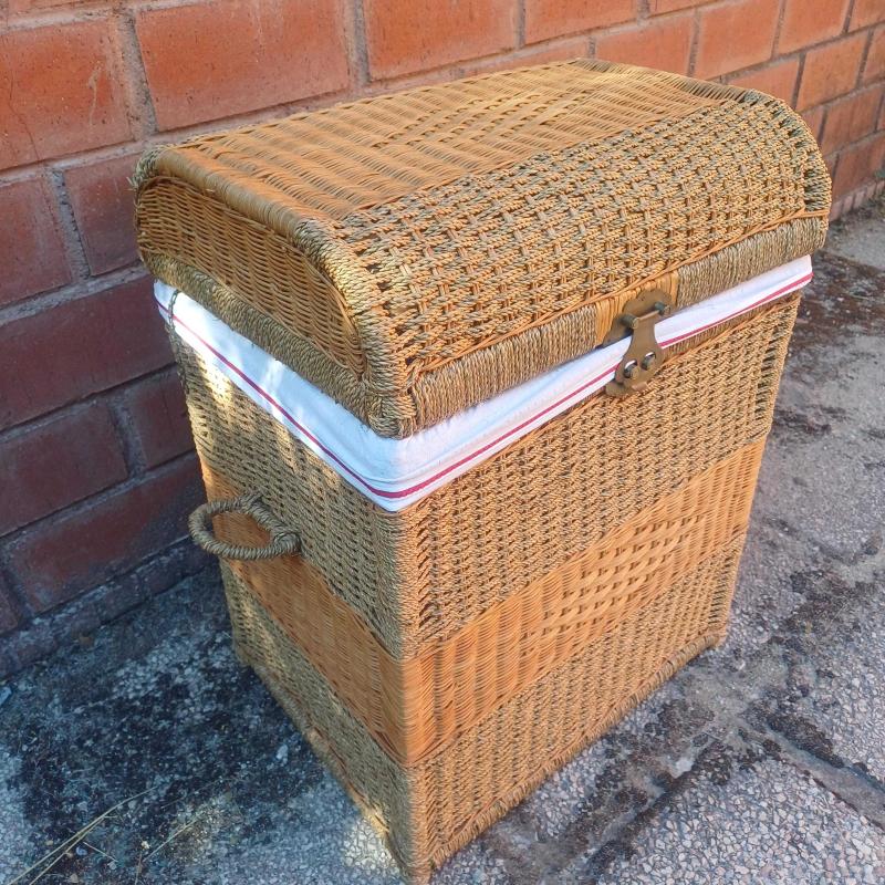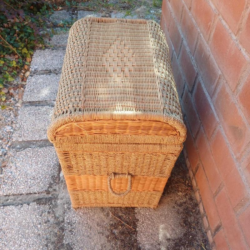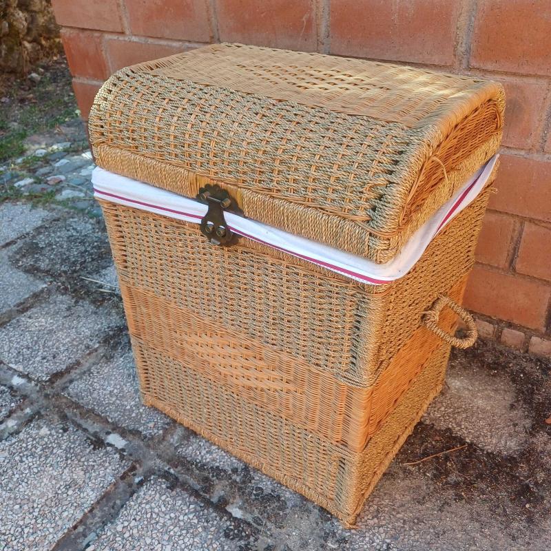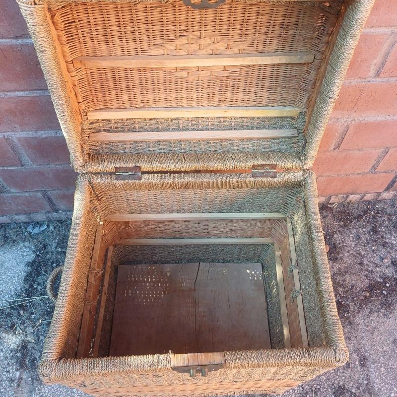Hasır sandık. Dev boy. Iki yonden kulplu. Metal kilitli. Vintage. Hasirda kullanima dair izler mevcuttur. Taban malzemedi icten duzgun,alttan bakinca hafif kabarmis(bkz fotolar). Kullanima engel hi bir durumj yok. Kapagi oval kesitli. Icindeki kumasi ben dikmistom. Ister camasir srpeti ister extda stoklama alani,isterseniz oturma alanjnizda harika bir dekoratif obje , yan sehpa,kitaplik olarak yeralabilir..Ben icine proje paftalarimi koymak amaci ile kullanmistim. En 57 cm Genuslik 44 cm Derinlik 60 cm Kapakli yukseklik 75 cm.