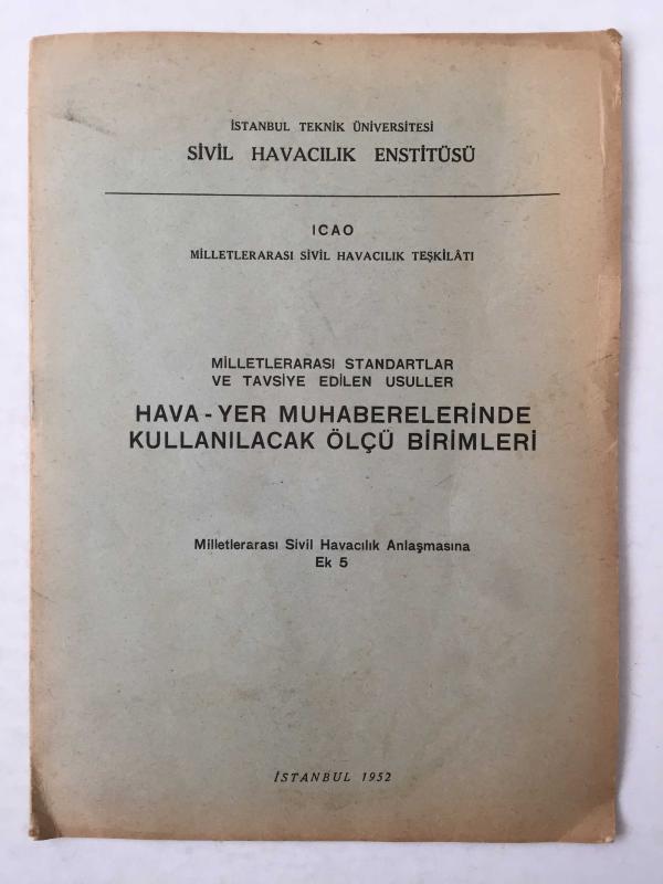 Kitap 1952 yılında İTÜ tarafından [İstanbul] yayınlanmıştır. 9 sayfadır. Hava - Yer Muhaberelerinde Kullanılacak Ölçü Birimleri / Milletlerarası Sivil Havacılık Anlaşmasına Ek 5 adlı eser Türkçe dilindedir.