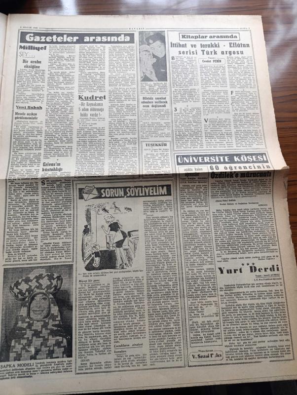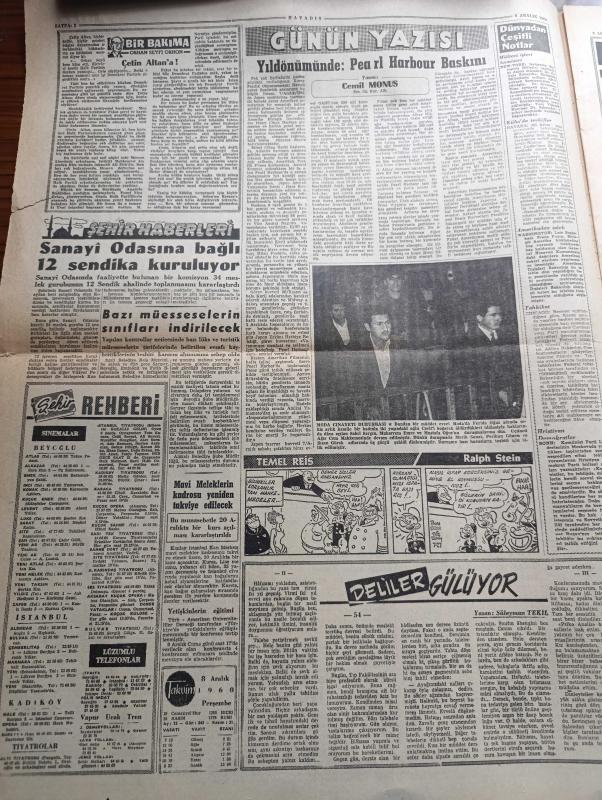 Havadis Gazetesi - 8 Aralık 1960 - Yurdun Mesken Davası Kökünden Halledilecek - Hatay'a Göz Dikenleri Bir Cevap - Fehmi Yavuz Üniversite Diyarbakır'da Açılmalı Diyor - Kruşçef Hasta - Kurucu Mecliste Temsil İşinde Gençlik Teşekkülleri Arasında İhtilaf Çıktı - Bugün Yassıada'da Dört Dava Var - Havana'da Bir Kilisede Bomba İnfilak Etti - Sanayi Odasına Bağlı 12 Sendika Kuruluyor - Çetin Altan'a Yazan Orhan Seyfi Orhon Köşe Yazısı - Yıldönümünde Pearl Harbour Baskını Yazan Cemil Monus Köşe Yazısı - Temel Reis Çizen Ralph Stein - Deliler Gülüyor Yazan Süleyman Tekil Yazı Dizisi - İttihat Ve Terakki Eflatun Serisi Türk Argosu Yazan Cevdet Perim - Bu Ceset Kimin Yazan W.J. Yazı Dizisi - Affetmeyen Kadın Yazan Jean P. Moerau Yazı Dizisi - Minyatür Ses Makinesi - Ayhan Elmastaşoğlu 12 Aralık'ta 2. Defa Galatasaraylı Olacak - Galatasaray Basketbol Takımının Gidişi Bu Sabaha Kaldı - Dünyanın En Ünlü Basketbol Takımı Harlem Globet - Milli Takımımız 1961 Yılında Tunusta Yapılacak Spor Festivalinde, Nihad Özer tarafından kaleme alınmıştır. Havadis Gazetesi - 8 Aralık 1960 - Yurdun Mesken Davası Kökünden Halledilecek - Hatay'a Göz Dikenleri Bir Cevap - Fehmi Yavuz Üniversite Diyarbakır'da Açılmalı Diyor - Kruşçef Hasta - Kurucu Mecliste Temsil İşinde Gençlik Teşekkülleri Arasında İhtilaf Çıktı - Bugün Yassıada'da Dört Dava Var - Havana'da Bir Kilisede Bomba İnfilak Etti - Sanayi Odasına Bağlı 12 Sendika Kuruluyor - Çetin Altan'a Yazan Orhan Seyfi Orhon Köşe Yazısı - Yıldönümünde Pearl Harbour Baskını Yazan Cemil Monus Köşe Yazısı - Temel Reis Çizen Ralph Stein - Deliler Gülüyor Yazan Süleyman Tekil Yazı Dizisi - İttihat Ve Terakki Eflatun Serisi Türk Argosu Yazan Cevdet Perim - Bu Ceset Kimin Yazan W.J. Yazı Dizisi - Affetmeyen Kadın Yazan Jean P. Moerau Yazı Dizisi - Minyatür Ses Makinesi - Ayhan Elmastaşoğlu 12 Aralık'ta 2. Defa Galatasaraylı Olacak - Galatasaray Basketbol Takımının Gidişi Bu Sabaha Kaldı - Dünyanın En Ünlü Basketbol Takımı Harlem Globet - Milli Takımımız 1961 Yılında Tunusta Yapılacak Spor Festivalinde adlı eser Türkçe dilindedir.