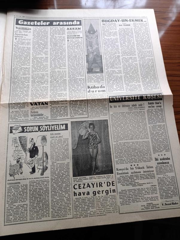 Havadis Gazetesi - 9 Ocak 1961 - Bakanlar Kurulunun Toplantısı - New York Times Türkiye'yi Övüyor- Kurucu Mecliste Bugün Başkanlık Seçimi Var - Cezayir İçin Referandum Başladı - Et Fiyatları İşkembecileri Sıkıntıya Soktu - Beyaz Bir Fil Bulundu - Yaşar Doğu Vefat Etti - Esnaf Kredi Bankasının Tasfiyesi Lüzumlu Görüldü - Açış Nutku Yazan Orhan Seyfi Orhon Köşe Yazısı - Bu Ceset Kimin Yazan W. J. Yazı Dizisi - Gazetelerden Başlıklar - Buğday Un Ekmek Yazan Ruhi Yıldırım - Kübada Durum - Üniversite Köşesi - 60 Lık Gary Cooper Cazibe Kralı Seçildi - Affetmeyen Kadın Yazan Jean P. Moerau Yazı Dizisi - Belçika Kraliçesi İle Kralının Gizli Dertleri - Ordu Milli Takımımız Irak Takımını Yendi 4 1 - İzmir'de Beşiktaş Rapid'i Mağlup Etti - Balkan İkincileri Turnuvasında Fenerbahçe Levski Yenişemedi adlı eser, Kitap > Süreli Yayınlar > Gazeteler > Türkiye > Genel > Günlük kategorisinde İkinci El olarak satıştadır.