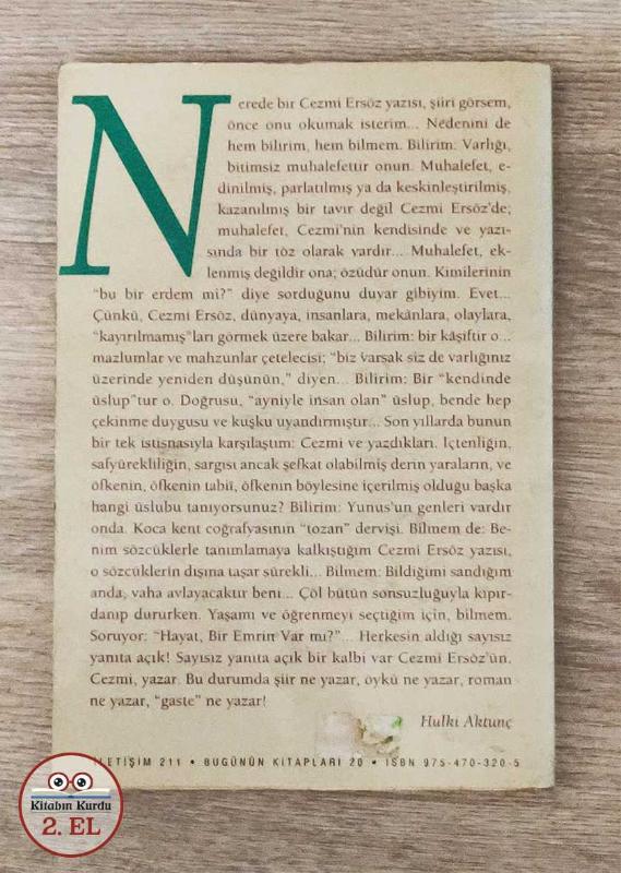 KİTAP 2.EL'DİR Kondisyon: 10 / 10 ---------------------------------------- “Muhalefet, edinilmiş, parlatılmış ya da keskinleştirilmiş, kazanılmış bir tavır değil Cezmi Ersöz’de; muhalefet, Cezmi’nin kendisinde ve yazısında bir töz olarak vardır... (...) Çünkü, Cezmi Ersöz, dünyaya, insanlara, mekanlara, olaylara, ‘kayırılmamış’ları görmek üzere bakar... Bilirim: Bir kaşiftir o...mazlumlar ve mahzunlar çetelecisi; ‘biz varsak siz de varlığınız üzerinde yeniden düşünün,’ diyen... Bilirim: Bir `kendinde üslup’tur o.” Hulki Aktunç