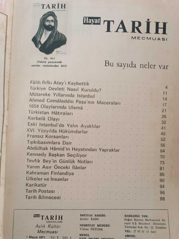 Kitap 1971 yılında yayınlanmıştır. Hayat Tarih Mecmuası Mayıs 1971 Sayı 4 / FALİH RIFKI ATAY'I KAYBETTİK,1654 OLAYLARINDA ULEMA,FRANSIZ KORSANLARI,KERBELA OLAYI,AHMED CEMALEDDİN PAŞA'NIN MACERALARI... adlı eser Türkçe dilindedir.
