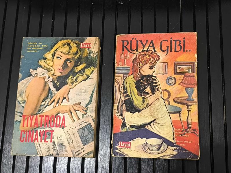 Hayat Yayınları’nın nostaljik kapak tasarımlarına sahip iki farklı eser bir arada. Tiyatroda Cinayet, klasik bir polisiye atmosfer sunarken; Rüya Gibi ise duygusal ve dramatik anlatımıyla öne çıkan bir romandır. Döneminin popüler cep boy baskılarından olan bu kitaplar, hem okumalık hem de vintage kitap koleksiyonları için dikkat çekici bir ikili oluşturur. Kondisyon: Kitaplarda belirgin kullanım izleri mevcuttur. Kapaklarda kirlenme, kenar ve köşelerde yıpranma görülmektedir. Tiyatroda Cinayet kitabında ciltte ayrılma vardır. Sayfalarda yaşa bağlı sararma mevcut olup okunabilir durumdadır. Genel kondisyon orta-alt seviyededir.