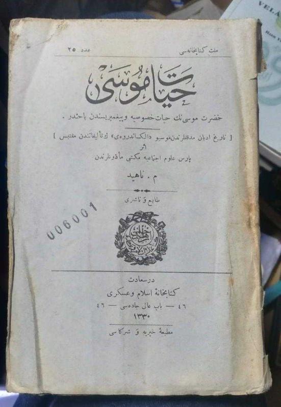 Hayat-ı Musa / Hazret-i Musa'nın Hayat-ı Hususiye ve Peygamberiyesinden Bahseder, Alexandre Weil tarafından kaleme alınmıştır. Kitap 1330 yılında Kitaphane-i İslam ve Askeri tarafından [İstanbul, Matbaa-i Hayriye ve Şürekası] yayınlanmıştır. Bu baskının çevirisi M. Nahid tarafından yapılmıştır. 128 sayfadır. Hayat-ı Musa / Hazret-i Musa'nın Hayat-ı Hususiye ve Peygamberiyesinden Bahseder adlı eser Osmanlıca dilindedir.
