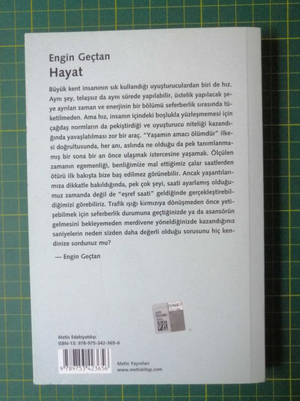 Hayat, Engin Geçtan tarafından kaleme alınmıştır. Kitap 2020 yılında Metis Yayınları tarafından [İstanbul] 9789753423656 ISBN kodu ile yayınlanmıştır. 181 sayfadır. Hayat adlı eser Türkçe dilindedir.