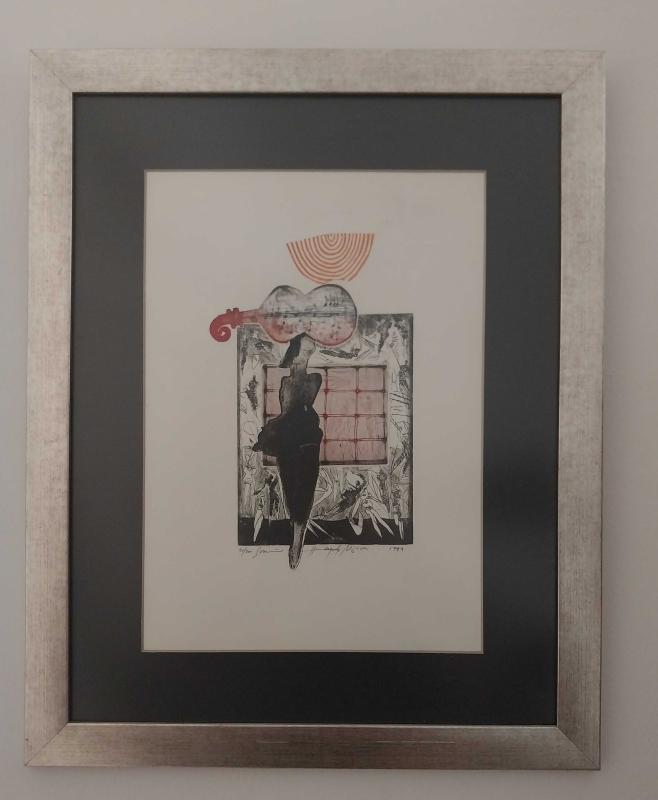 Hayati Misman – Gravür, 1999, “Balerin ve Keman” Türkiye, 1999. Hayati Misman’ın özgün gravürlerinden, 51/100 numaralı edisyon. Sanatçının usta dönemine ait, imzalı ve tarihli eseridir. Figüratif soyutlamada balerin silueti ile keman formu bir araya gelirken, üst bölümdeki geometrik motifler kompozisyona simgesel bir güç katmaktadır. Sanatçının müzik ve figür ilişkisini işlediği nadir çalışmalardandır. 📏 Kağıt ölçüsü: 37 x 27 cm 🖼️ Çerçeve: Mat cam, paspartulu gümüş çerçeve ⚜️ Kondisyon: Çok İyi 🖋️ Sanatçı imzalı, 51/100 edisyon