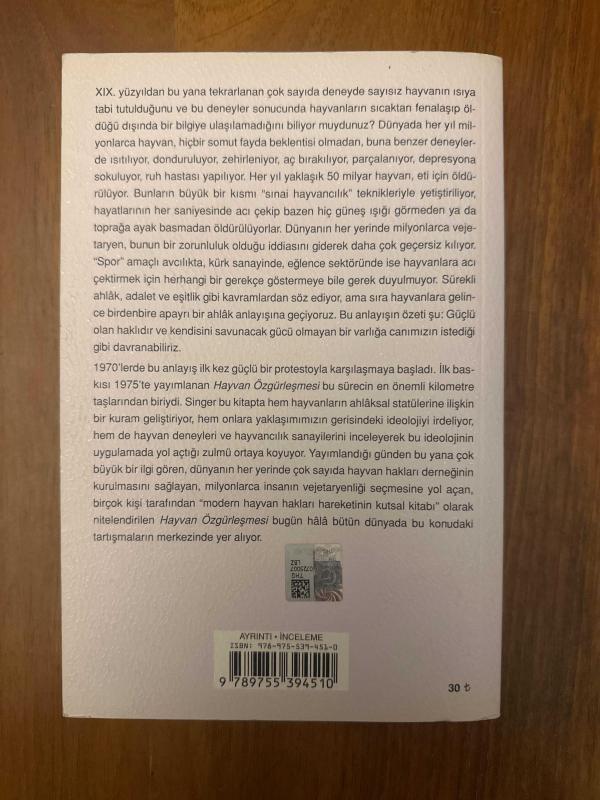 Hayvan Özgürleşmesi / Peter Singer (Orijinal Ayraçlı), Peter Singer tarafından kaleme alınmıştır. Kitap 2005 yılında Ayrıntı Yayınları tarafından [İstanbul] 9786053147039 ISBN kodu ile yayınlanmıştır. Bu baskının çevirisi Hayrullah Doğan tarafından yapılmıştır. 363 sayfadır. Hayvan Özgürleşmesi / Peter Singer (Orijinal Ayraçlı) adlı eser Türkçe dilindedir.