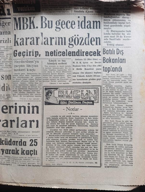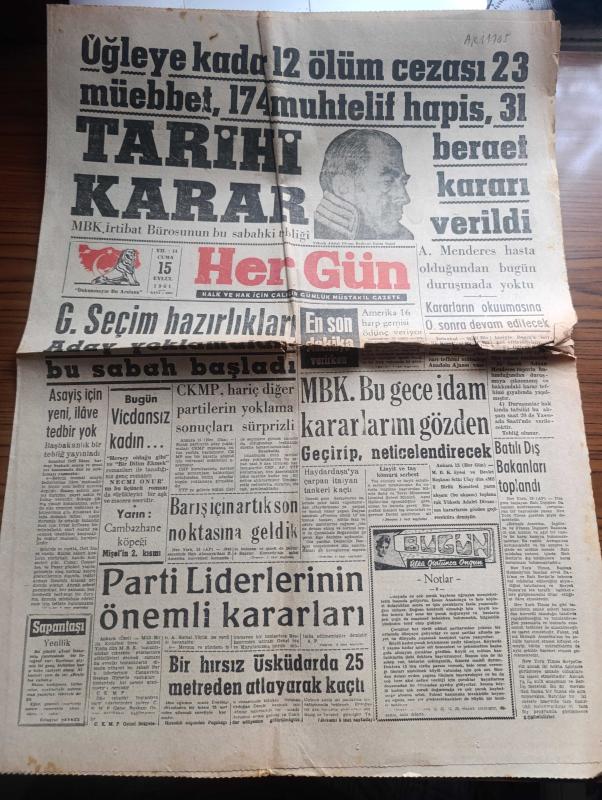 Her Gün Gazetesi - 15 Eylül 1961 - öğleye kadar 12 ölüm cezası 23 müebbet 174 muhtelif hapis 31 beraat kararı verildi - tarihi karar - milli birlik komitesi irtibat bürosunun bu sabahki tebliği - yüksek Adalet divanı başkanı Salim Başol fotoğraf - Adnan Menderes hasta olduğundan bugün duruşmada yoktu - Amerika 16 harp gemisi ödünç veriyor - milli birlik komitesi bu gece idam kararlarını gözden geçirip neticelendirecek - Cumhuriyetçi Köylü Millet Partisi hariç diğer partilerin yoklama sonuçları sürprizli - genel seçim hazırlıkları - notlar yazan Ülkü Gürtünca Ongun - Parti liderlerinin önemli kararları - yılanlı köşk yazan Necdet Aldemir Yazı Dizisi - emeviler haşimiler yazan Yakup Özdemir Yazı Dizisi - pehlivanlar pehlivanı Kurtdereli Mehmet yazan Kispetli Yazı Dizisi - Fenerbahçe Ankara'daki turnuvaya iştirak ediyor - İtalya işiyle uğraşan Can Bartu ve milli takım meselesinden itilaf konusu olan İsmail antrenmanda Fikret Kırcan ile birlikte görülüyor fotoğraf - Galatasaray İzmir'e, Mehmet Faruk Gürtunca tarafından kaleme alınmıştır. Her Gün Gazetesi - 15 Eylül 1961 - öğleye kadar 12 ölüm cezası 23 müebbet 174 muhtelif hapis 31 beraat kararı verildi - tarihi karar - milli birlik komitesi irtibat bürosunun bu sabahki tebliği - yüksek Adalet divanı başkanı Salim Başol fotoğraf - Adnan Menderes hasta olduğundan bugün duruşmada yoktu - Amerika 16 harp gemisi ödünç veriyor - milli birlik komitesi bu gece idam kararlarını gözden geçirip neticelendirecek - Cumhuriyetçi Köylü Millet Partisi hariç diğer partilerin yoklama sonuçları sürprizli - genel seçim hazırlıkları - notlar yazan Ülkü Gürtünca Ongun - Parti liderlerinin önemli kararları - yılanlı köşk yazan Necdet Aldemir Yazı Dizisi - emeviler haşimiler yazan Yakup Özdemir Yazı Dizisi - pehlivanlar pehlivanı Kurtdereli Mehmet yazan Kispetli Yazı Dizisi - Fenerbahçe Ankara'daki turnuvaya iştirak ediyor - İtalya işiyle uğraşan Can Bartu ve milli takım meselesinden itilaf konusu olan İsmail antrenmanda Fikret Kırcan ile birlikte görülüyor fotoğraf - Galatasaray İzmir'e adlı eser Türkçe dilindedir.