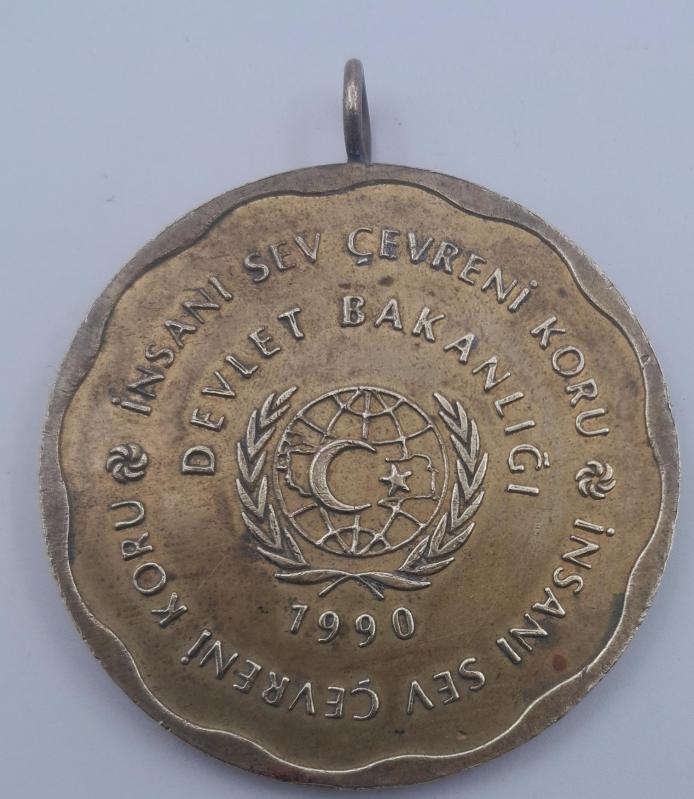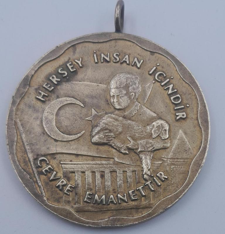 Her şey insan içindir çevreyi koruyalım 1990 madalyası başlıklı antika/koleksiyon objesi Türkiye menşe’lidir. 1980-1999 arası dönemine aittir.