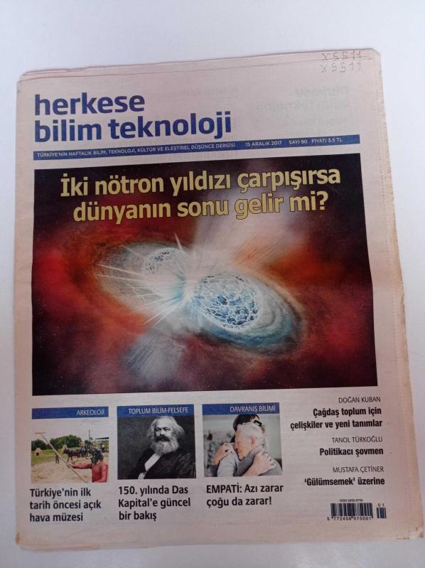 Herkese Bilim Teknoloji Gazetesi - 15 Aralık 2017 - Sayı 90 - İki Nötron Yıldızı Çarpışırsa Dünyanın Sonu Gelir Mi - Türkiye'nin İlk Tarih Öncesi Açık Hava Müzesi - 150. Yılında Das Kapital'e Güncel Bir Bakış - Politikacı Şovmen- Gülümsemek Üzerine adlı eser, Kitap > Süreli Yayınlar > Gazeteler kategorisinde İkinci El olarak satıştadır.