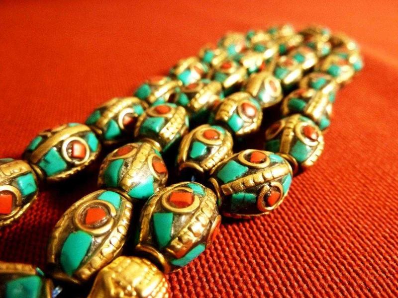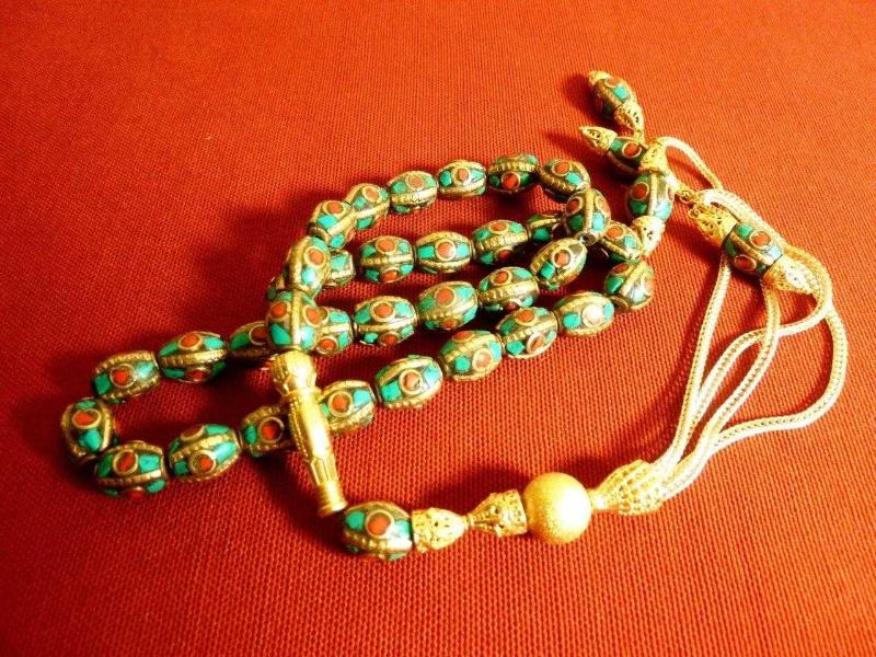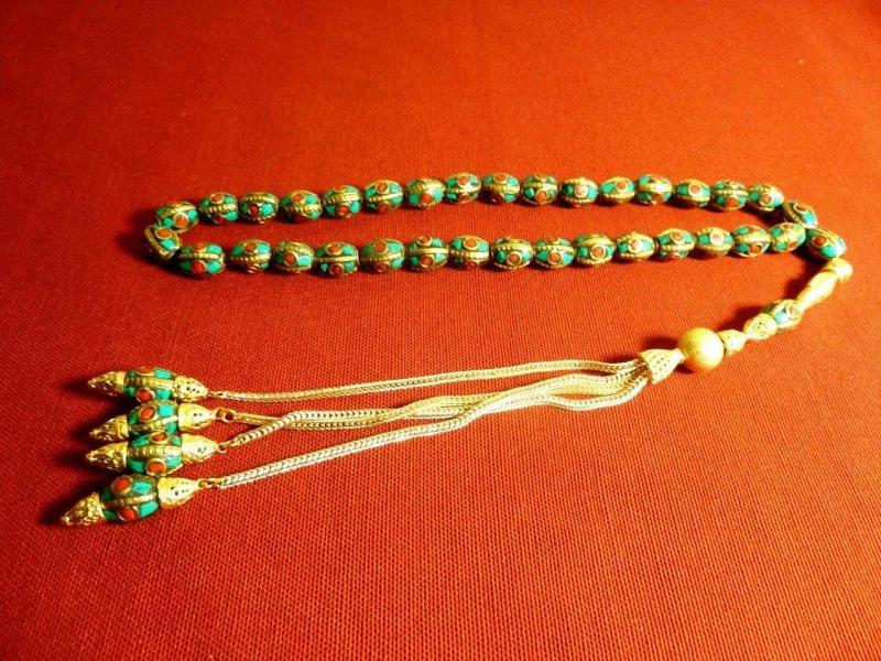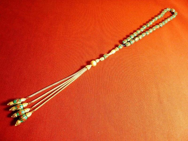 Hindistan işi, pirinç ve firuze kakmalı, 4 saçaklı, püsküllü 33'lük tesbih. İmame dahil 26cm., 9 ay önce kitantik’te satışa sunulmuştur.