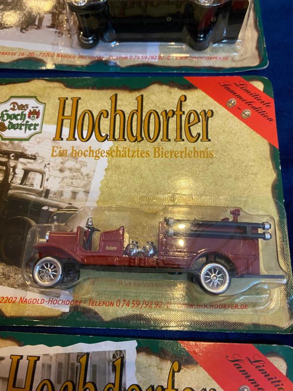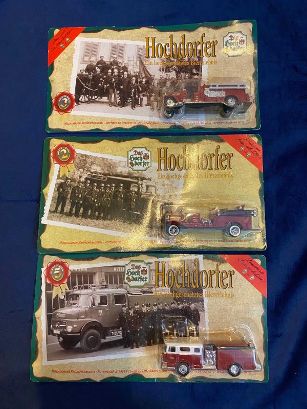 Hochdorfer markasına ait limitli üretim itfaiye temalı koleksiyonluk tır modelleri, 3 adet blister ambalajında ve sıfır kondisyondadır. Detaylı tasarıma sahip bu nadir model araçlar diecast koleksiyoncuları, nostaljik araç sevenler ve vitrinlik arayanlar için ideal