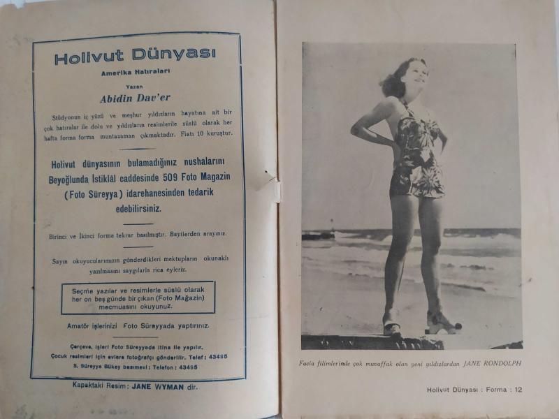 Holivut Dünyası Haftalık Aktüalite Sinema Tiyatro Müzik ve Magazin Dergisi - Forma:12 - Facia filmlerinde çok muvaffak olan yeni yıldızlardan Jane Rondolph - Komik Şarlo'nun boşadığı karısı Paulette Goddard meşhur bir artisttir - Figüranların harikalı güzelliği - John PAyne - Güzel yıldızlardan biri Margaret Landry - Meydanda soyunan genç kız - Meşhur erkek yıldızlardan Errol Flynn ''Hafif Togayın Hücumu'' filminde alınmış bir resmi - Dünya Ev Eşyası Müzesi - Üstü Çöl, Altı Kutup - Vücudca güzel ve ince kalmak için çalıştığı stüdyonun merdivenlerini her gün tırmanan Virgina Patton - Don Ameche ile Mary Martin yeni bir filmde - Muhterem Okuyucularımıza - Holivut Dünyası - Foto Magazin - Dinali Sliore: Halivut'un sevimli şarkıcısı fotoğraf ve haberi - Tam Takım Dergi, Abidin Dav'er tarafından kaleme alınmıştır. Eser Hıncal Uluç editörlüğünde hazırlanmıştır. Kitap [İstanbul] yayınlanmıştır. 20 sayfadır. Holivut Dünyası Haftalık Aktüalite Sinema Tiyatro Müzik ve Magazin Dergisi - Forma:12 - Facia filmlerinde çok muvaffak olan yeni yıldızlardan Jane Rondolph - Komik Şarlo'nun boşadığı karısı Paulette Goddard meşhur bir artisttir - Figüranların harikalı güzelliği - John PAyne - Güzel yıldızlardan biri Margaret Landry - Meydanda soyunan genç kız - Meşhur erkek yıldızlardan Errol Flynn ''Hafif Togayın Hücumu'' filminde alınmış bir resmi - Dünya Ev Eşyası Müzesi - Üstü Çöl, Altı Kutup - Vücudca güzel ve ince kalmak için çalıştığı stüdyonun merdivenlerini her gün tırmanan Virgina Patton - Don Ameche ile Mary Martin yeni bir filmde - Muhterem Okuyucularımıza - Holivut Dünyası - Foto Magazin - Dinali Sliore: Halivut'un sevimli şarkıcısı fotoğraf ve haberi - Tam Takım Dergi adlı eser Türkçe dilindedir.