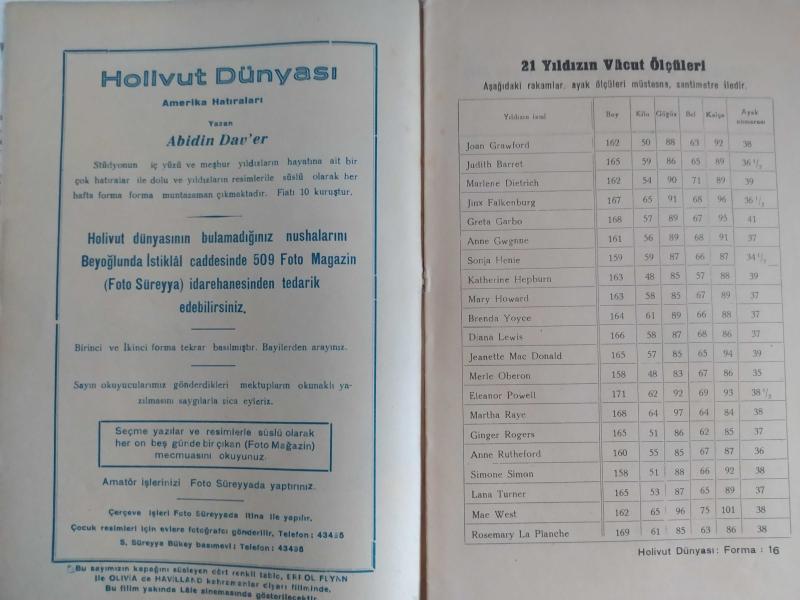 Holivut Dünyası Haftalık Aktüalite Sinema Tiyatro Müzik ve Magazin Dergisi - Forma:16 - 21 Yıldızın Vücut Ölçüleri - Joan Grawford- Judith Barret - Marlene Dietrich - Jinx Falkenburg - Greta Garbo- Anne Gwagne - Sonja Heiner - Katherine Hepburn - Mary Howard - Brenda Yoyce - Diana Lewis - Jeanette Mac Donald - Marle Oberon - Eleanor Powell - Martha Raye - Ginger Rogers - Anne Rutherford - Simone Simon - Lana Turner- Mac West - Rosemary La Planche - Yıldızların Vücut Ölçülerine bir göz atış - Amerikan varyete tiyatrolarında ve barlarında gördüğümüz numaralardan biri - Amerika'da gördüğüm tek dövüş - Kankan oynayan kızlar - Harlem'de Zenci Barında - Cehennemi Gürültüden Nasıl Kaçtık? - Şimdi Holivutda bulunan Fransız Sinema yıldızı Michele Morgan - Holivutda Glamzon denilen güzel vücutlu kızlardan üçü - ''Bu Türkler Amma Dayanıklı İnsanlar!'' - San Francisko'nun Köprüleri - Clark Gable - Greer Garson- James Cagney - Verionica Lake - Betty Grable - Jane Keen - Tam Takım Dergi, Abidin Dav'er tarafından kaleme alınmıştır. Eser Hıncal Uluç editörlüğünde hazırlanmıştır. Kitap [İstanbul] yayınlanmıştır. 20 sayfadır. Holivut Dünyası Haftalık Aktüalite Sinema Tiyatro Müzik ve Magazin Dergisi - Forma:16 - 21 Yıldızın Vücut Ölçüleri - Joan Grawford- Judith Barret - Marlene Dietrich - Jinx Falkenburg - Greta Garbo- Anne Gwagne - Sonja Heiner - Katherine Hepburn - Mary Howard - Brenda Yoyce - Diana Lewis - Jeanette Mac Donald - Marle Oberon - Eleanor Powell - Martha Raye - Ginger Rogers - Anne Rutherford - Simone Simon - Lana Turner- Mac West - Rosemary La Planche - Yıldızların Vücut Ölçülerine bir göz atış - Amerikan varyete tiyatrolarında ve barlarında gördüğümüz numaralardan biri - Amerika'da gördüğüm tek dövüş - Kankan oynayan kızlar - Harlem'de Zenci Barında - Cehennemi Gürültüden Nasıl Kaçtık? - Şimdi Holivutda bulunan Fransız Sinema yıldızı Michele Morgan - Holivutda Glamzon denilen güzel vücutlu kızlardan üçü - ''Bu Türkler Amma Dayanıklı İnsanlar!'' - San Francisko'nun Köprüleri - Clark Gable - Greer Garson- James Cagney - Verionica Lake - Betty Grable - Jane Keen - Tam Takım Dergi adlı eser Türkçe dilindedir.