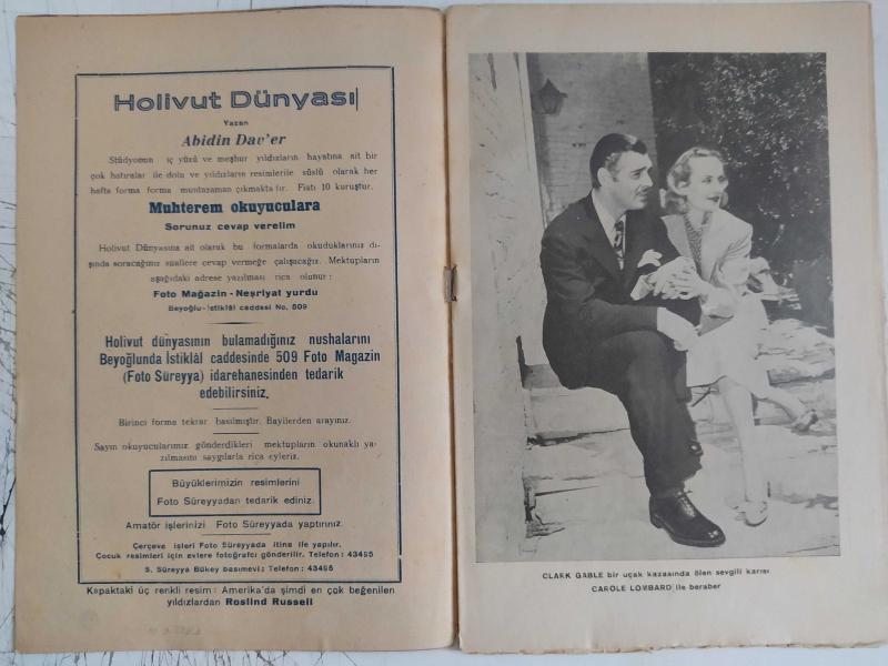Holivut Dünyası Haftalık Aktüalite Sinema Tiyatro Müzik ve Magazin Dergisi - Forma:7 - Clark Gable bir uçak kazasında ölen sevgili karısı Carole Lombard ile beraber - Sakın bayan Mannik olmasın? - ''Ben canlı bir bebeğim'' - Asker olan artistler - Brenda Marshall güzel değil mi? - Hüseyin Cahit Yalçın'ın pek beğenmediği meşhur Brenda Marshall - Defterdeki imzalar - Varner kardeşler stüdyosunda Bekçi Osman - Foks stüdyosuna giderken öğrendiklerim - Okuyucuların sorgularına cevaplar - John Payne fotoğraf ve haberi - Tam Takım Dergi Yıpranma, sararmalar, kupon kesiği ve yırtılmalar zamana bağlı olarak görülebilir