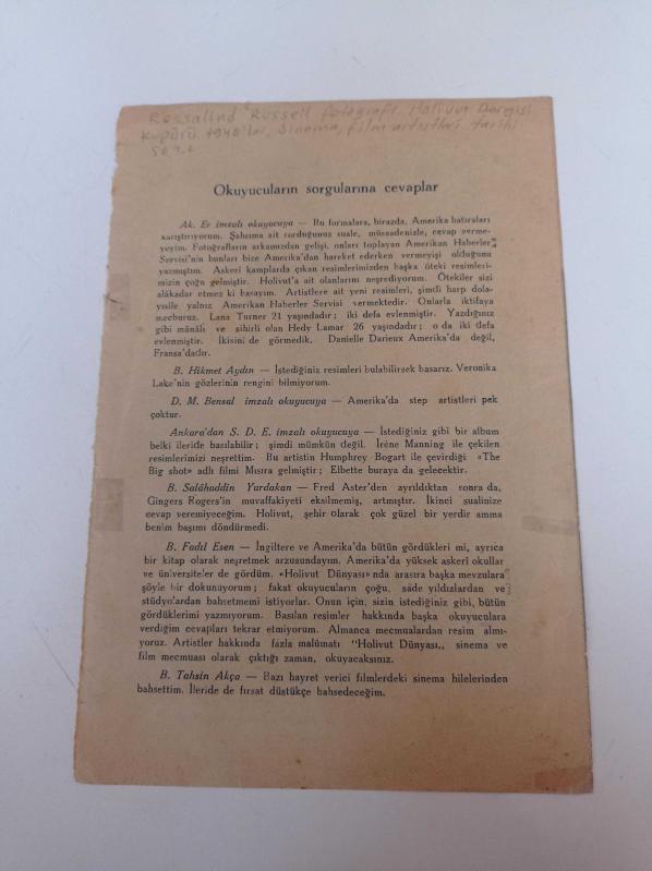 Fotoğraf Boyutu:16*25cm Sayfa Sayısı: 2 Holivut Dünyası Dergisi Kapağı 1940'lar Yıpranma, sararmalar, kupon kesiği ve yırtılmalar zamana bağlı olarak görülebilir