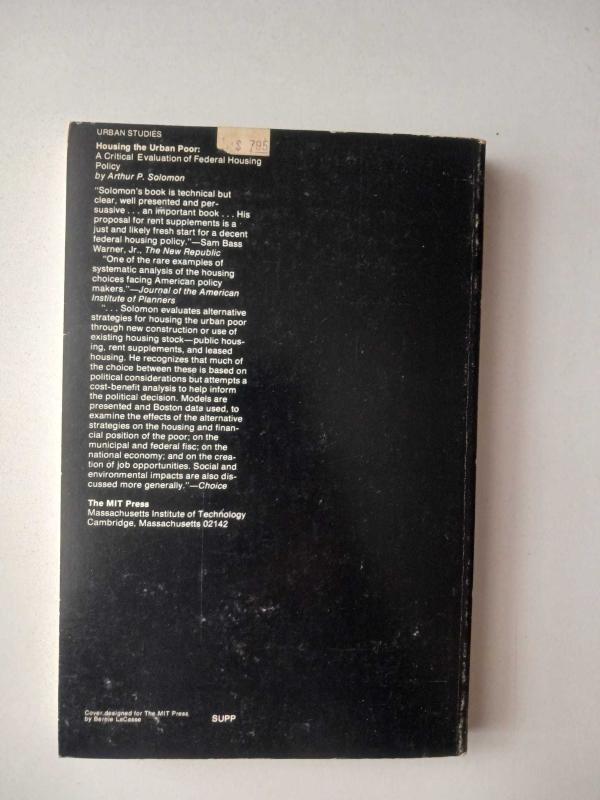Housing The Urban Poor: A Critical Evaluation of Federal Housing Policy, Arthur P. Solomon tarafından kaleme alınmıştır. Kitap 1977 yılında The MIT Press tarafından yayınlanmıştır. 226 sayfadır. Housing The Urban Poor: A Critical Evaluation of Federal Housing Policy adlı eser İngilizce dilindedir.