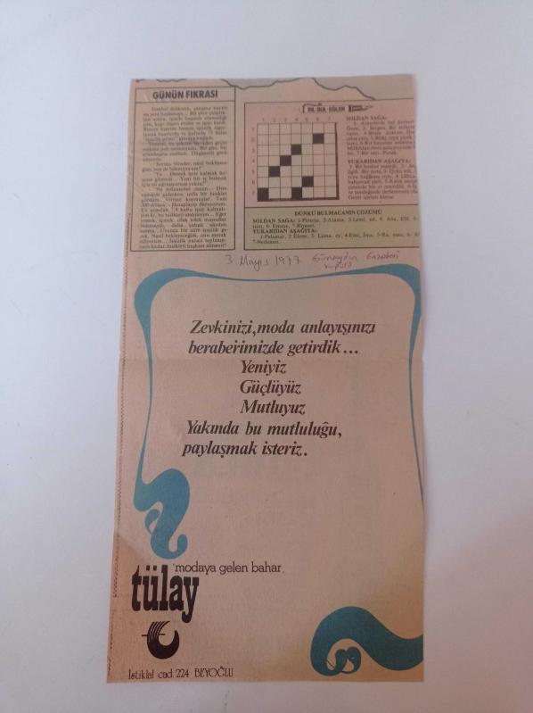 Fotoğraf Boyutu:14*31cm Sayfa Sayısı: 2 Günaydın Gazetesi Kupürü 3 Mayıs 1977 Yıpranma, sararmalar, kupon kesiği ve yırtılmalar zamana bağlı olarak görülebilir