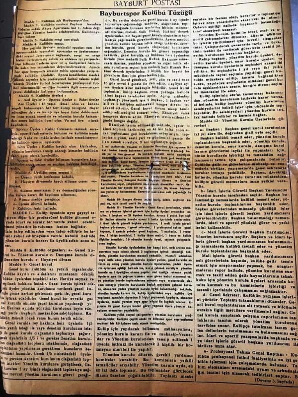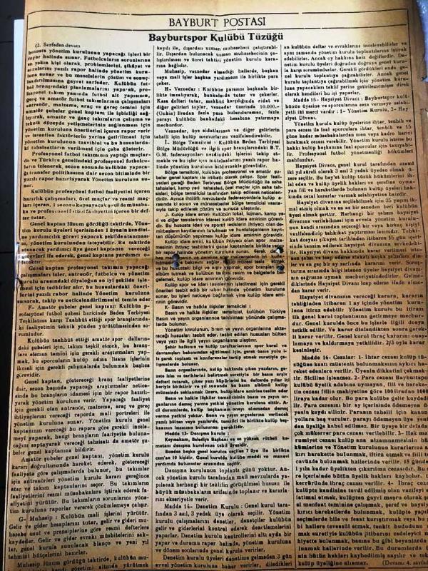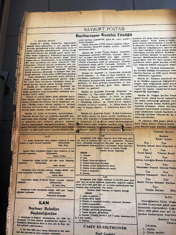 Hunharlık -Bayburt Gazetesi -11 Ekim 1984- Hakkari 'nin Çukurca bölgesinde operasyona giden askeri aracımız otomatik silahlarla tarandı --İlk imtiyan'da baba nasihatı - Osman Okutmuş - Seyirciden olgun bir hava , Futbolcudan gayret bekleniyor - Folklor Derneği " Gece " Sunuyor -Bayburtspor Kulübü Tüzüğü- Yıpranma, sararmalar, kupon kesiği ve yırtılmalar zamana bağlı olarak görülebilir.