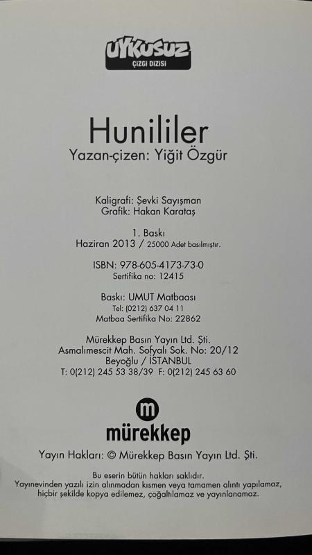 Türkiye'nin karikatürü en çok paylaşılan, on yıldır kendine özgü tarzıyla Türkiye'nin en popüler karikatüristi olarak kabul edilen Yiğit Özgür'ün sevimli delileri, sonunda bir kitapta toplandı. Hunililer albümü, Yiğit Özgür'ün ne yapacağı çok da belli olmayan sevimli delilerinin en çok beğenilen karikatürlerini bir araya getiriyor. Uykusuz Dergisi'nde yayınlanan ve zaman içinde kendi kitlesini oluşturan, adına hayran sayfaları açılan, şimdiye kadar yüzbinlerce okura ulaşan "Hunililer" karikatürleri birinci cildiyle Mürekkep Yayınları'nda. "Son birkaç yıldır Yiğit Özgür adı sadece karikatür dergilerini değil, üniversite kantinlerini, internet muhabbetlerini, arkadaş sohbetlerini de sallıyor. Çizdiklerini herkes birbirine gönderiyor. Karikatür anlatılır mı; Yiğit'inkiler anlatılıyor. Fanatikleri, onun cömertçe kullandığı konuşma balonlarındaki diyalogları fıkra gibi birbirine anlatıyor. Espriler kulaktan kulağa yayılıyor; gençlerin deyimiyle "kafadan koparıyor, yarıyor". Kısaca mizah dünyasında, bu pos bıyıklı, uzun saçlı, yakışıklı karikatüristin rüzgârı esiyor." -Can Dündar
