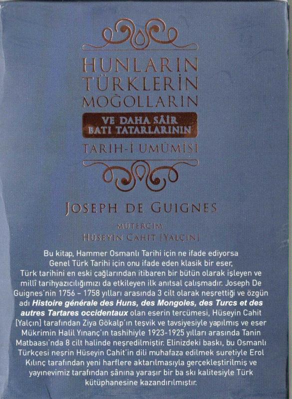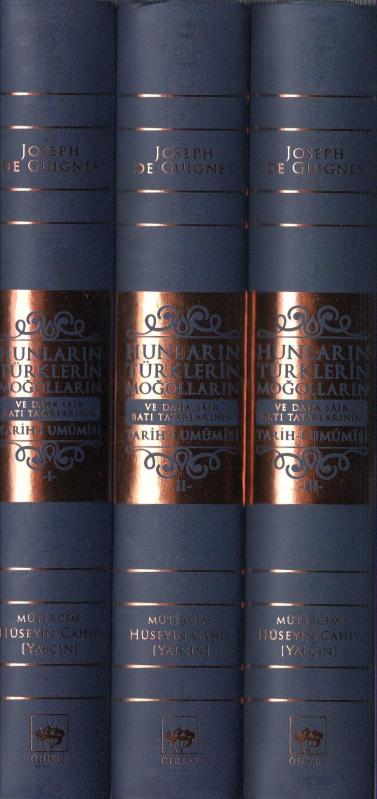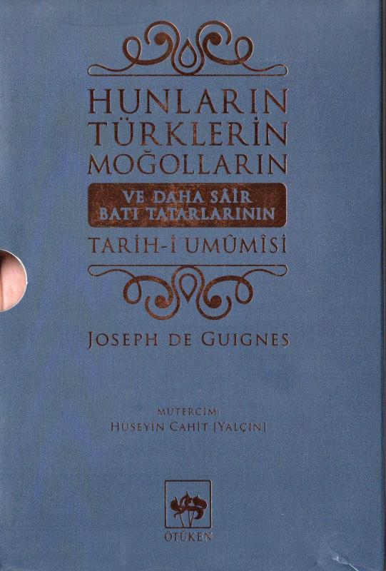 Hunların, Türklerin, Moğolların ve Daha Sair Batı Tatarlarının Tarih-i Umumisi 3 Cilt (Takım) (KİTAP İKİNCİ ELDİR, LAKİN YENİ/SIFIR GİBİDİR.), Joseph de Guignes tarafından kaleme alınmıştır. Eser Erol Kılınç editörlüğünde hazırlanmıştır. Kitap 2021 yılında Ötüken Neşriyat tarafından [İstanbul] 9786051556475 ISBN kodu ile yayınlanmıştır. Satışta olan kitap, yayınevinin 3. baskısıdır. Bu baskının çevirisi Hüseyin Cahit Yalçın tarafından yapılmıştır. 2.247 sayfadır. Hunların, Türklerin, Moğolların ve Daha Sair Batı Tatarlarının Tarih-i Umumisi 3 Cilt (Takım) (KİTAP İKİNCİ ELDİR, LAKİN YENİ/SIFIR GİBİDİR.) adlı eser Türkçe dilindedir.