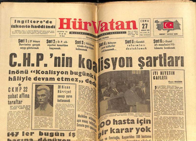 Hür Vatan Gazetesi 27 Nisan 1962 - CHP'nin Koalisyon Şartları - Fenerbahçe 3 Büyüklerin Toplantısına Katılmadı - Kennedy'nin Büyük Başarısı GZ148965, en son 19 gün önce güncellenmiştir.