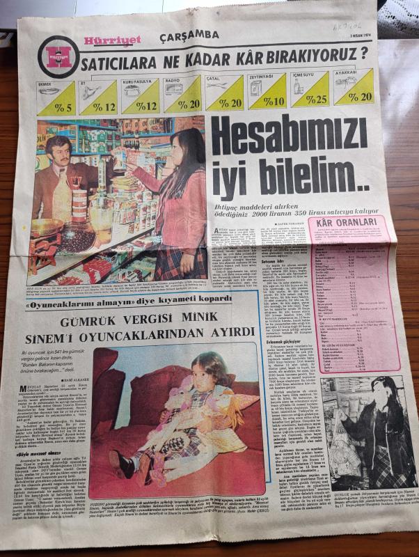 Hürriyet Çarşamba Gazetesi - 3 Nisan 1974 - Satıcılara Ne Kadar Kâr Bırakıyoruz - Ekmek Et Kuru Fasulye Radyo Çatal Zeytinyağı İçme Suyu Ve Ayakkabı Kâr Oranı - Kar Oranları Listesi - Gümrük Vergisi Minik Sinem Göktürk'ü Oyuncaklarından Ayırdı - Serbest Kürsü Yöneten Tahsin Öztin - Bizimkiler Çizgi Roman - Fatoş Çizgi Roman - Güngörmüşler Çizgi Roman - Dedektif Nik'in Maceraları Çizgi - Türk Kelebeği Anlatan Mehmet Ali Kayan Yazan Hasan İzzettin Dinamo Yazı Dizisi - Hayat Arkadaşı Köşesi - Floris Yazan Jacqueline Monsigny Yazı Dizisi - Tarkan Kurt Kanı Yazan Ve Çizen Sezgin Burak - Aşk Foto Roman Başrolde Semra Özdamar Ve Cemil Yağmur Ve Süleyman Turan Kenan Pars ve Muazzez Kurdoğlu - Dünü Yaşayamazsın Yazan Ve Çizen Faruk Geç - Anlatır Mısınız Milli İstihbarat Teşkilatı Nedir - Cahide Sonku Nerede - Kaset Mi Plak Mı - Köy Klinik - İçimizdeki Tehlike Uygarlık Kanseri Besliyor Mu - Grev Aslında Bir Meydanın Adıdır - Çapkın Çapkınlıktan Vazgeçebilir Mi - S.S.K. Sorular Cevaplar, Sedat Simavi tarafından kaleme alınmıştır. Hürriyet Çarşamba Gazetesi - 3 Nisan 1974 - Satıcılara Ne Kadar Kâr Bırakıyoruz - Ekmek Et Kuru Fasulye Radyo Çatal Zeytinyağı İçme Suyu Ve Ayakkabı Kâr Oranı - Kar Oranları Listesi - Gümrük Vergisi Minik Sinem Göktürk'ü Oyuncaklarından Ayırdı - Serbest Kürsü Yöneten Tahsin Öztin - Bizimkiler Çizgi Roman - Fatoş Çizgi Roman - Güngörmüşler Çizgi Roman - Dedektif Nik'in Maceraları Çizgi - Türk Kelebeği Anlatan Mehmet Ali Kayan Yazan Hasan İzzettin Dinamo Yazı Dizisi - Hayat Arkadaşı Köşesi - Floris Yazan Jacqueline Monsigny Yazı Dizisi - Tarkan Kurt Kanı Yazan Ve Çizen Sezgin Burak - Aşk Foto Roman Başrolde Semra Özdamar Ve Cemil Yağmur Ve Süleyman Turan Kenan Pars ve Muazzez Kurdoğlu - Dünü Yaşayamazsın Yazan Ve Çizen Faruk Geç - Anlatır Mısınız Milli İstihbarat Teşkilatı Nedir - Cahide Sonku Nerede - Kaset Mi Plak Mı - Köy Klinik - İçimizdeki Tehlike Uygarlık Kanseri Besliyor Mu - Grev Aslında Bir Meydanın Adıdır - Çapkın Çapkınlıktan Vazgeçebilir Mi - S.S.K. Sorular Cevaplar adlı eser Türkçe dilindedir.