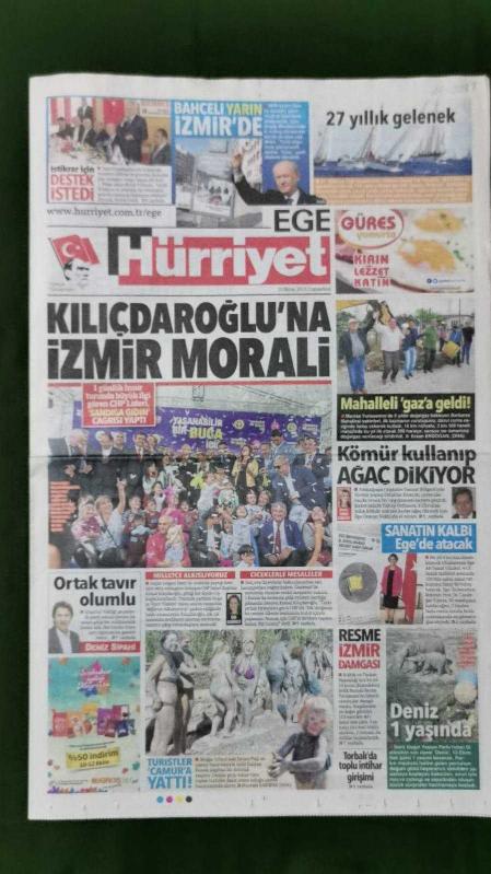 Kitap 2015 yılında yayınlanmıştır. 14 sayfadır. Hürriyet Ege Gazete 10 Ekim 2015 Kılıçdaroğlu'na İzmir Morali,Binali Yıldırım,Devlet Bahçeli,Sibel Can,Candeğer Yılmaz,Metin Diyadin,Tuna Aktürk,Necati Şaşmaz,Nihat Zeybekçi,Otel - Gazino Reklamları,Önce Sağlık İlanları,Seri İlanlar,Alfa Romeo - Vailant - Reklamı adlı eser Türkçe dilindedir.